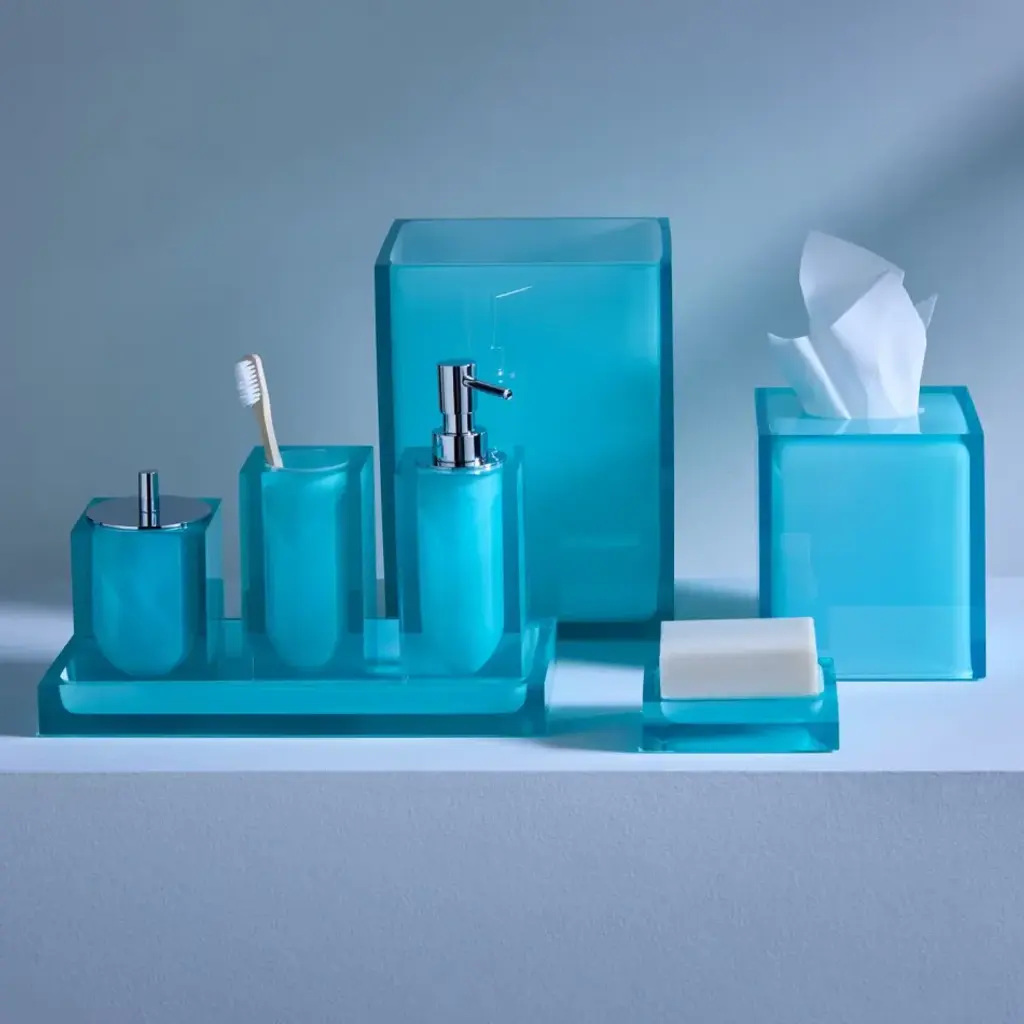 The newest addition to the successful Ice Lucite Collection; a tinge of blue with a frosted finish. A soothing and contemporary accent for the modern bathroom suite. Hand cut, glued and polished. 3/8" thick panels. Established 30 years ago in New York, Mike & Ally is known worldwide for their elegant, handmade enamel and lucite bath accessories. All items custom made to order; please allow 2 weeks for delivery. Please make your selection carefully; orders cannot be cancelled once submitted and items are not returnable.