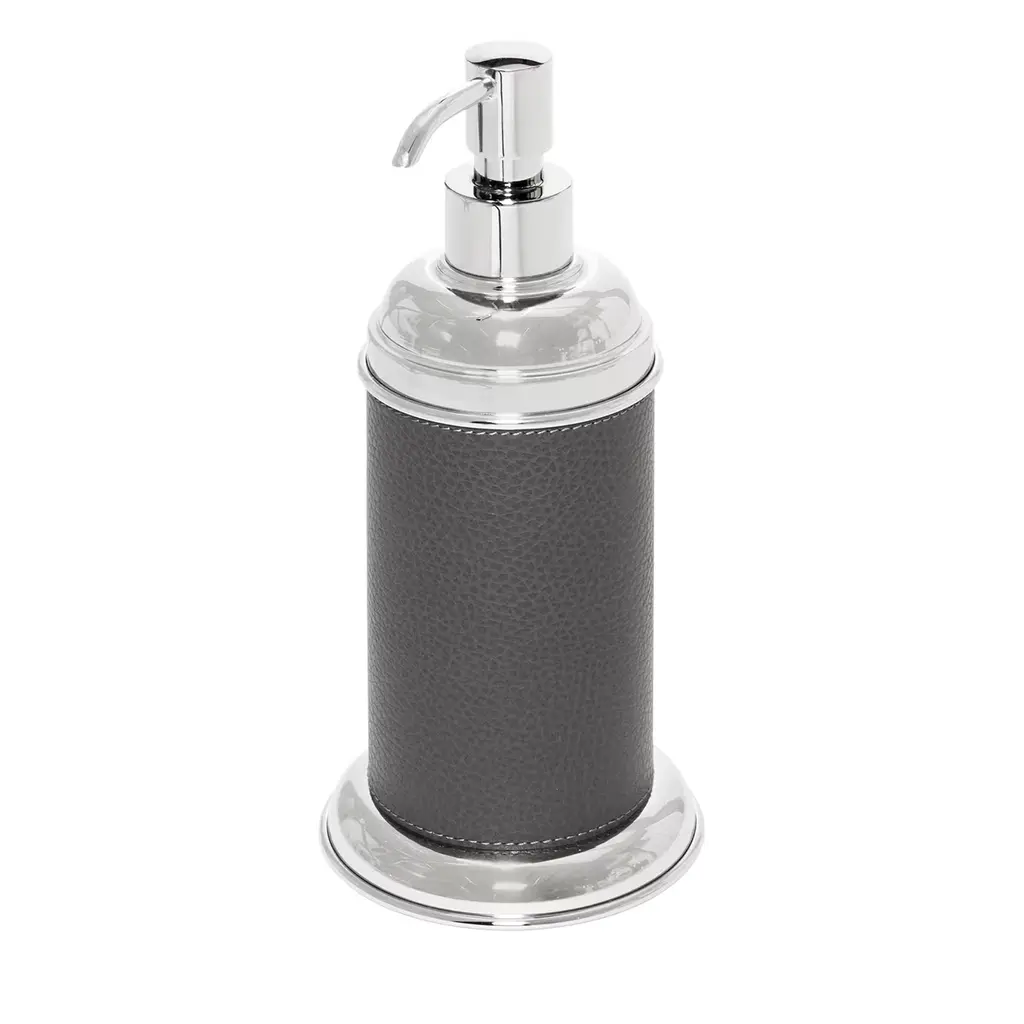 Merging style and function in a simple and versatile design perfect for both commercial and residential interiors, this refined dispenser for soap or hand sanitizer belongs to the 2021 Igea Collection by Pinetti available in a wide range of colors from the Malaga regenerated leather catalog. The refillable glass bottle with a polished metal spout is embellished with an anthracite gray leather band matching the small tray designed to keep the surface clean from spills.