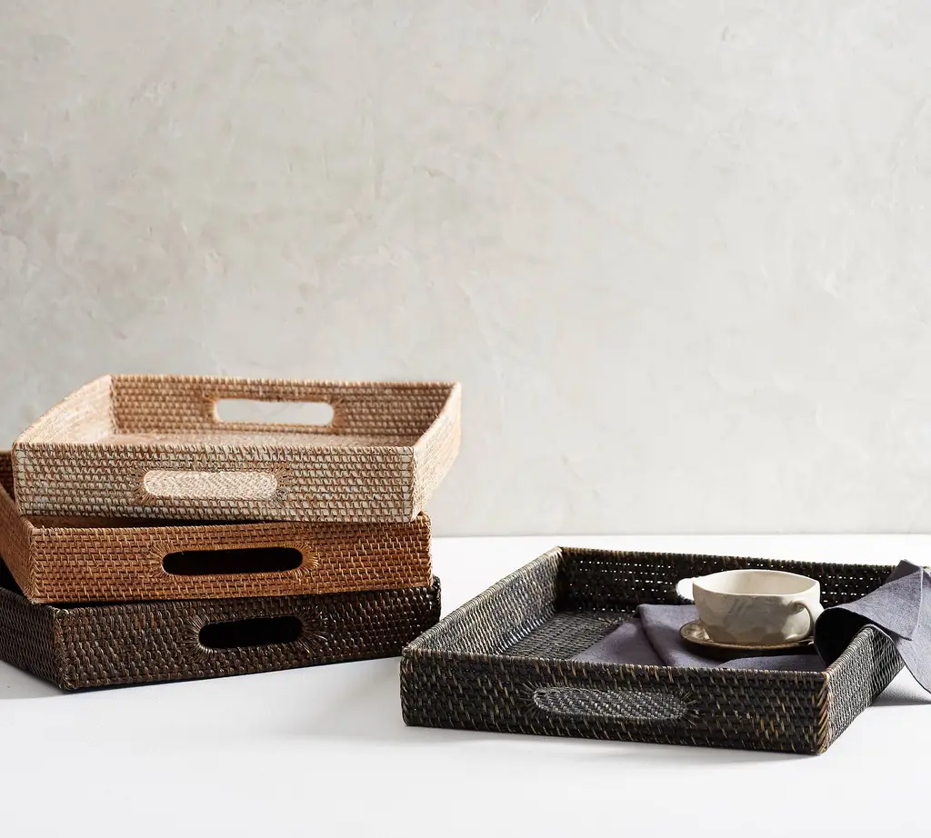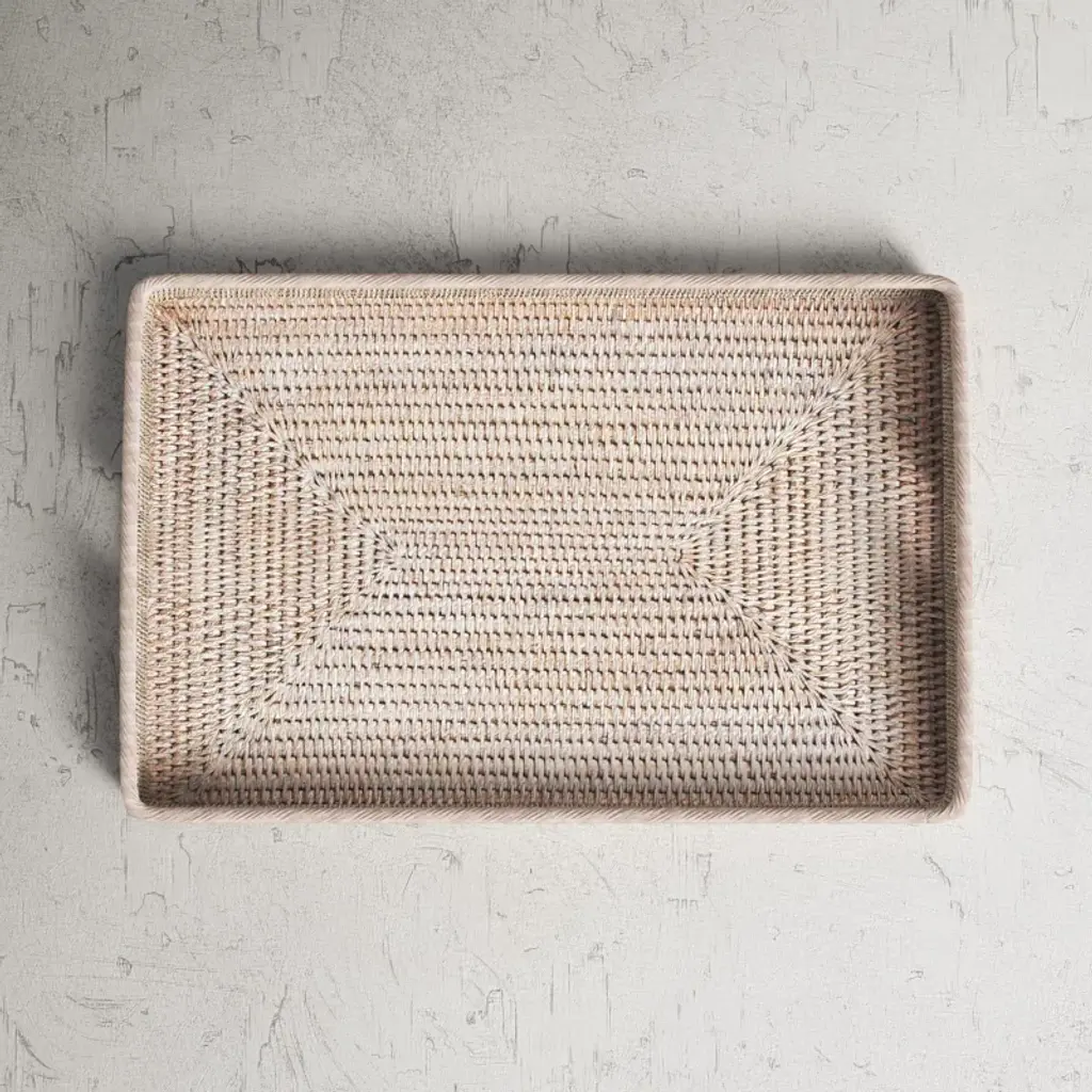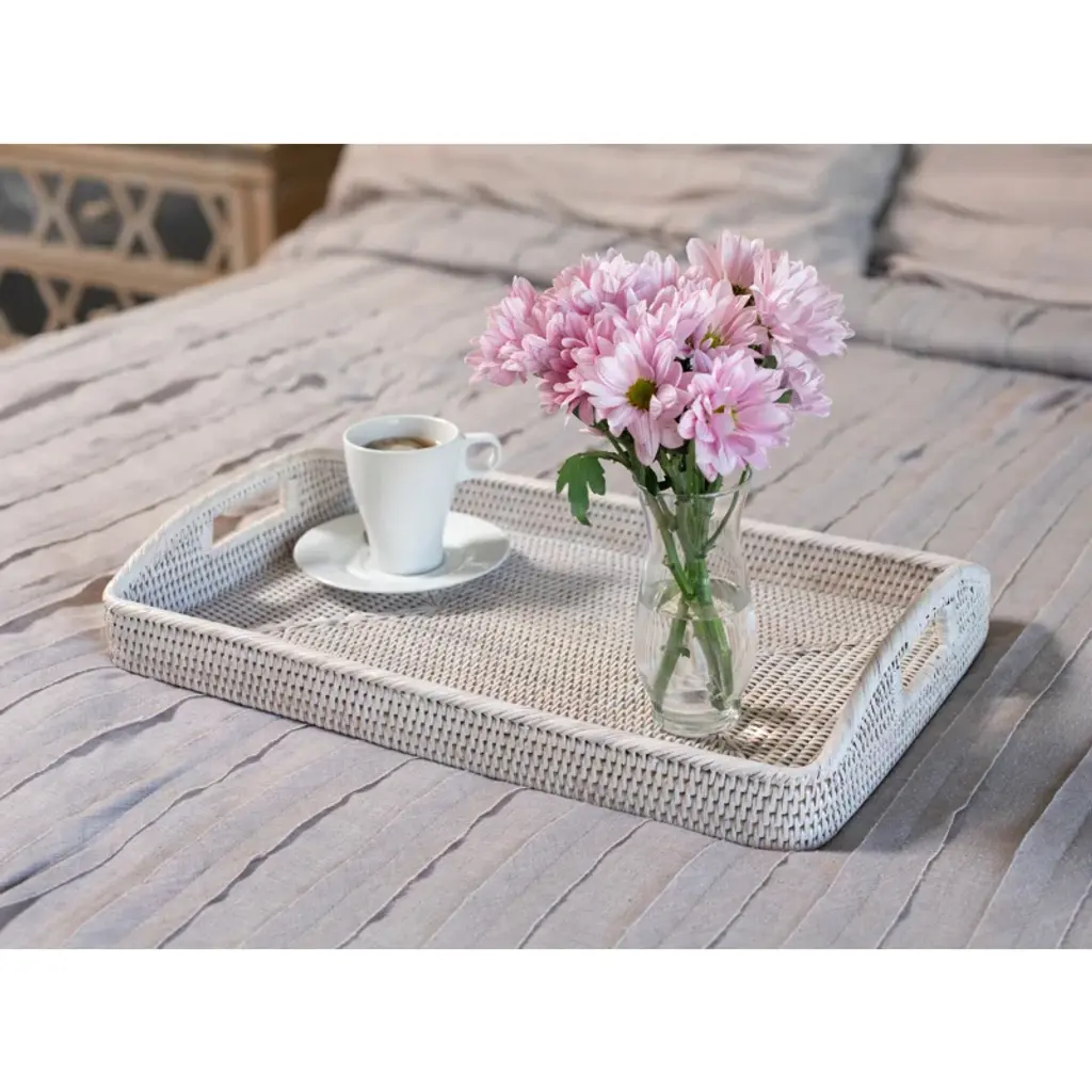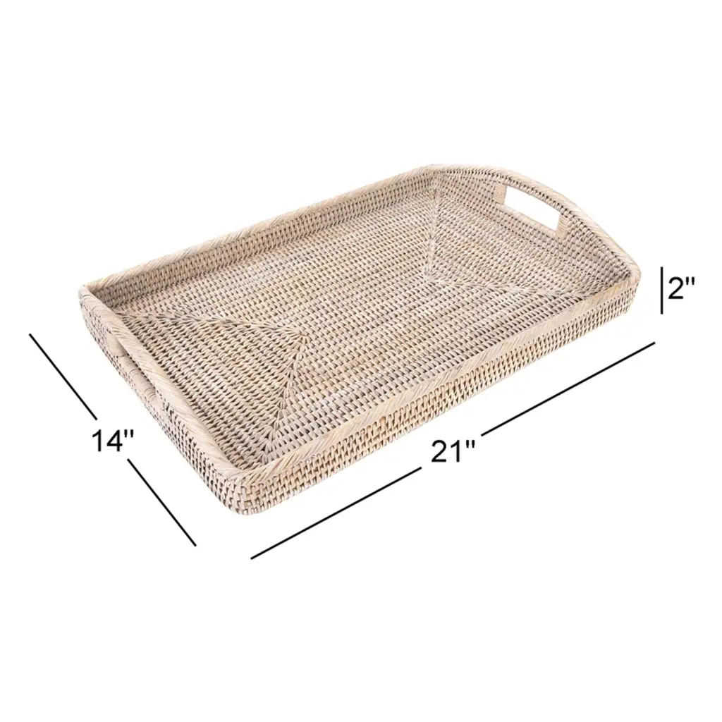 Whether you're entertaining guests at a party or getting organized, this versatile rattan serving tray is here to help. Teeming with texture, it's handwoven from rattan for an airy and natural look, making it right at home in classic and coastal arrangements. High walls with their rectangular shape prevent snacks or odds and ends from slipping off, while two handles make it easy to move this tray throughout your space. Best of all, this tray comes in the color of your choice, so you can make it your own.