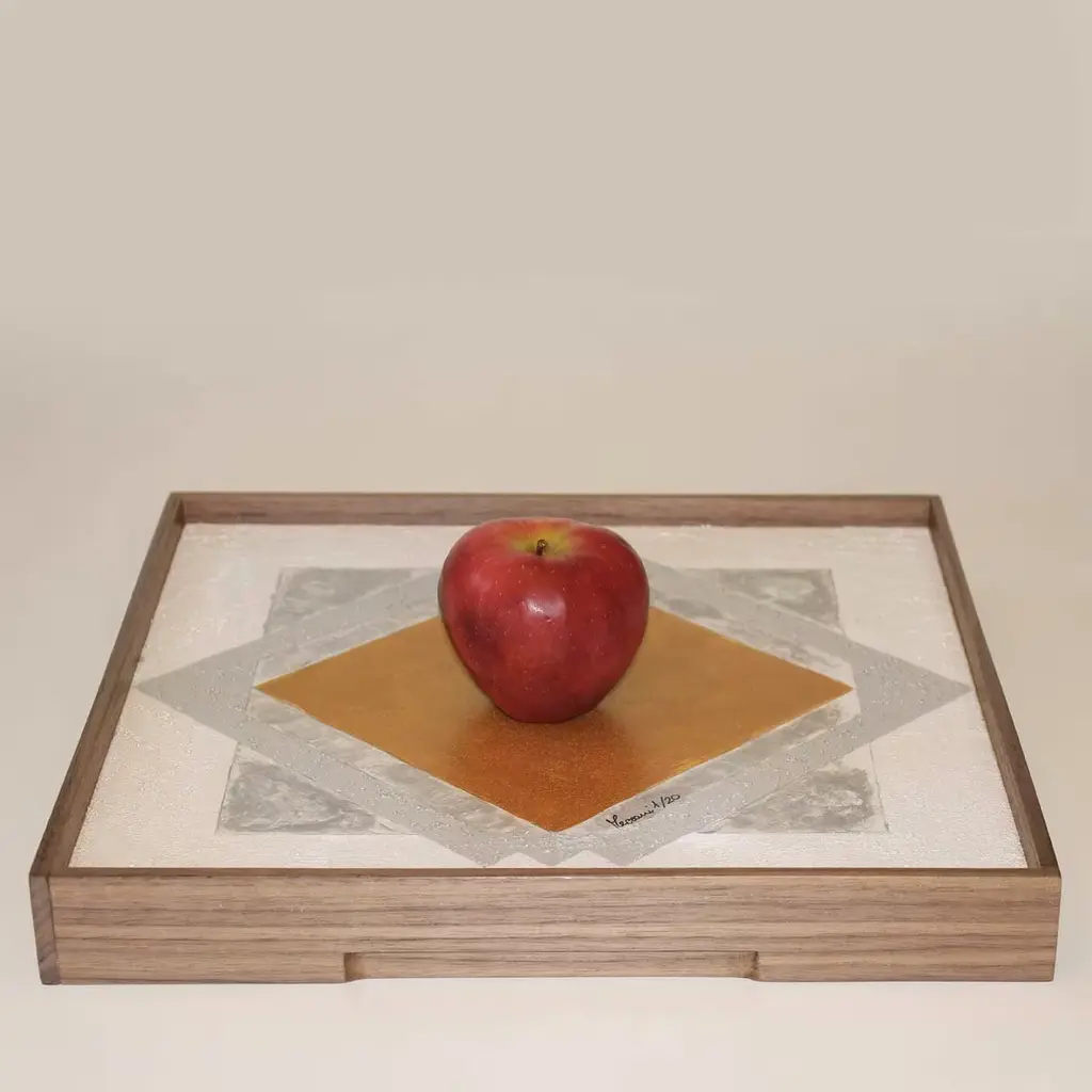 Crafted and painted by hand using colors such as white, cream, gray, and gold, this square tray establishes a perfect dialogue between linear design and vibrant decoration. The walnut frame offers the ideal background to a colorful diamond design created with water-based, non-toxic paint and finished with a protective, scratch-resistant coating. Suitable for a range of different interior styles, this stylish tray is part of a limited series of 20 original trays that can easily transition from the table to a console or mantelpiece to be displayed as a stunning decorative accent.