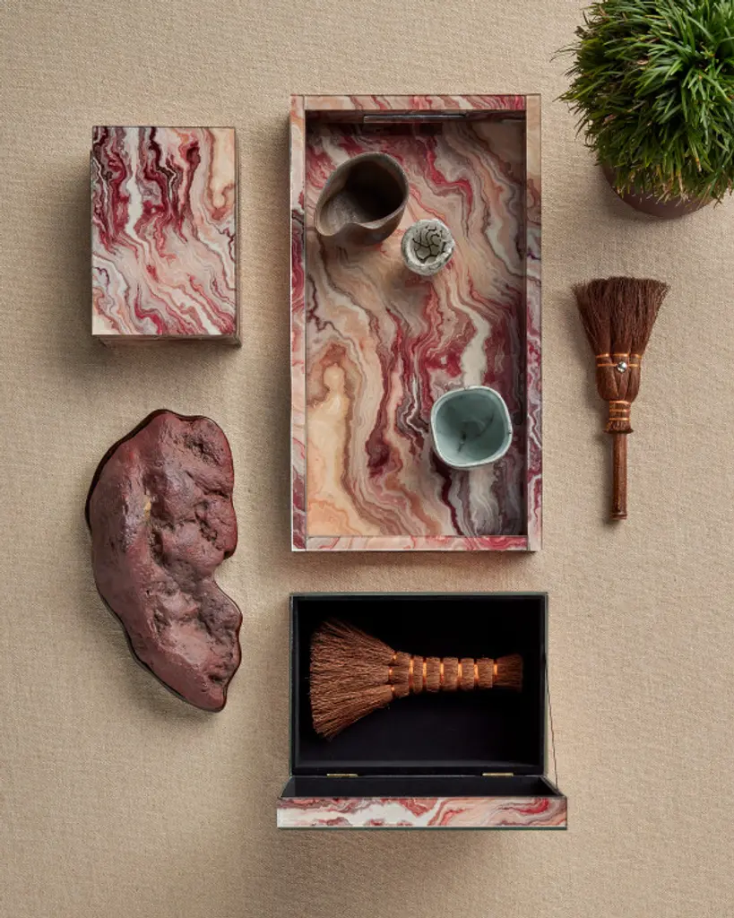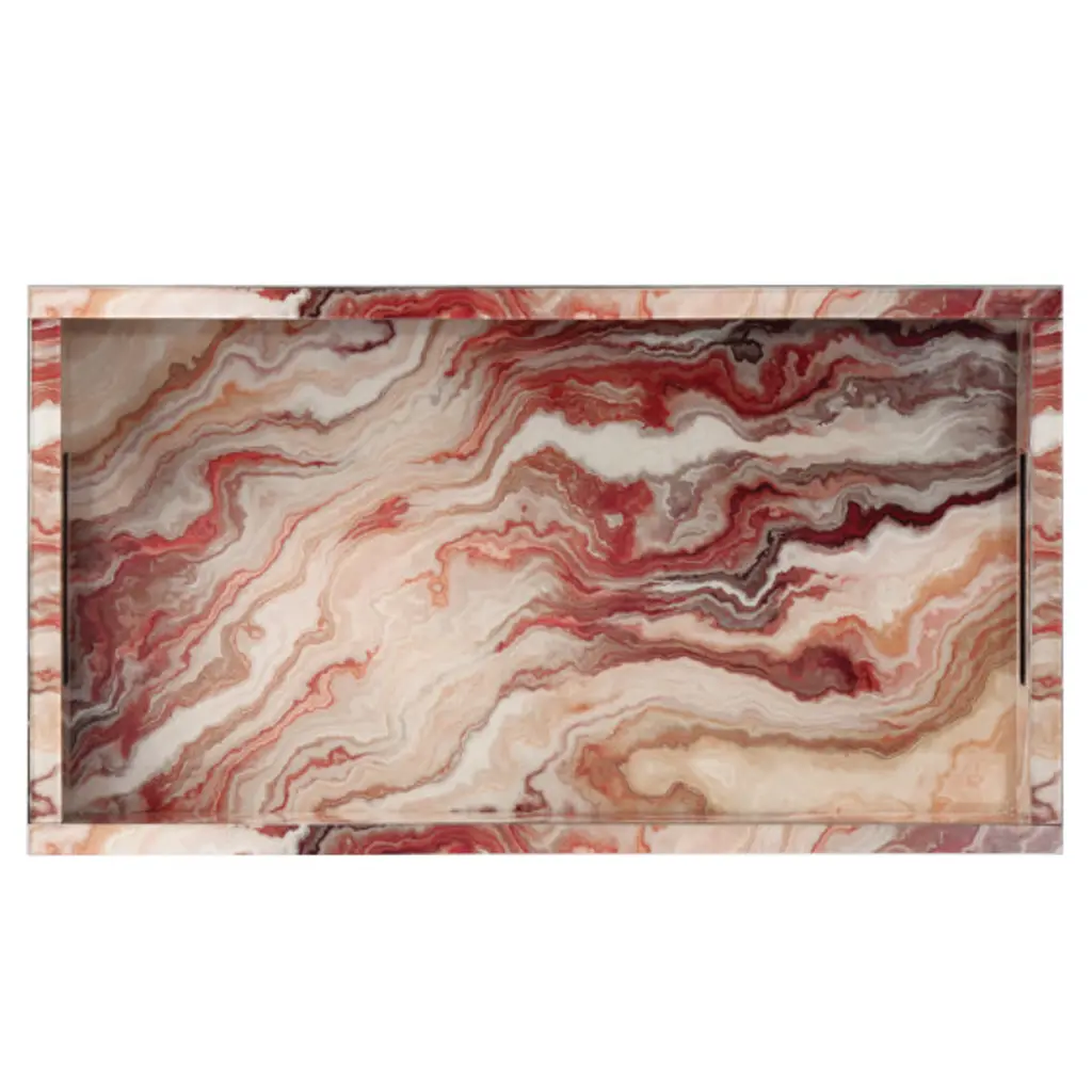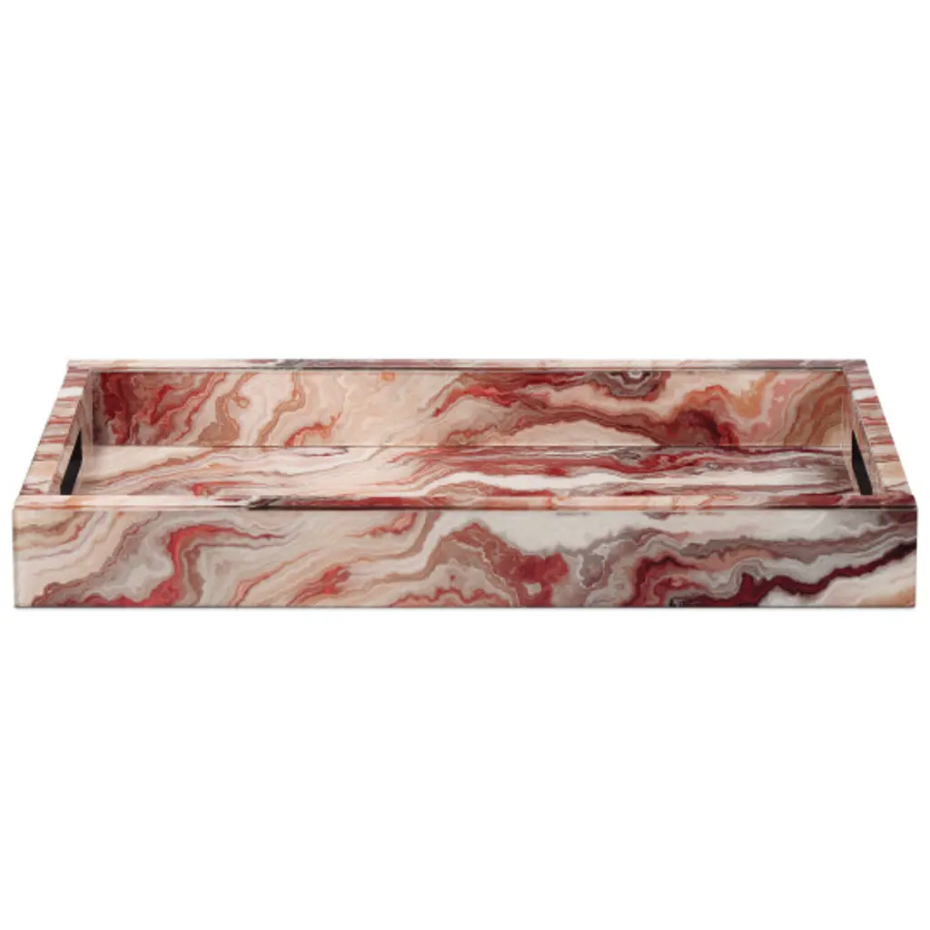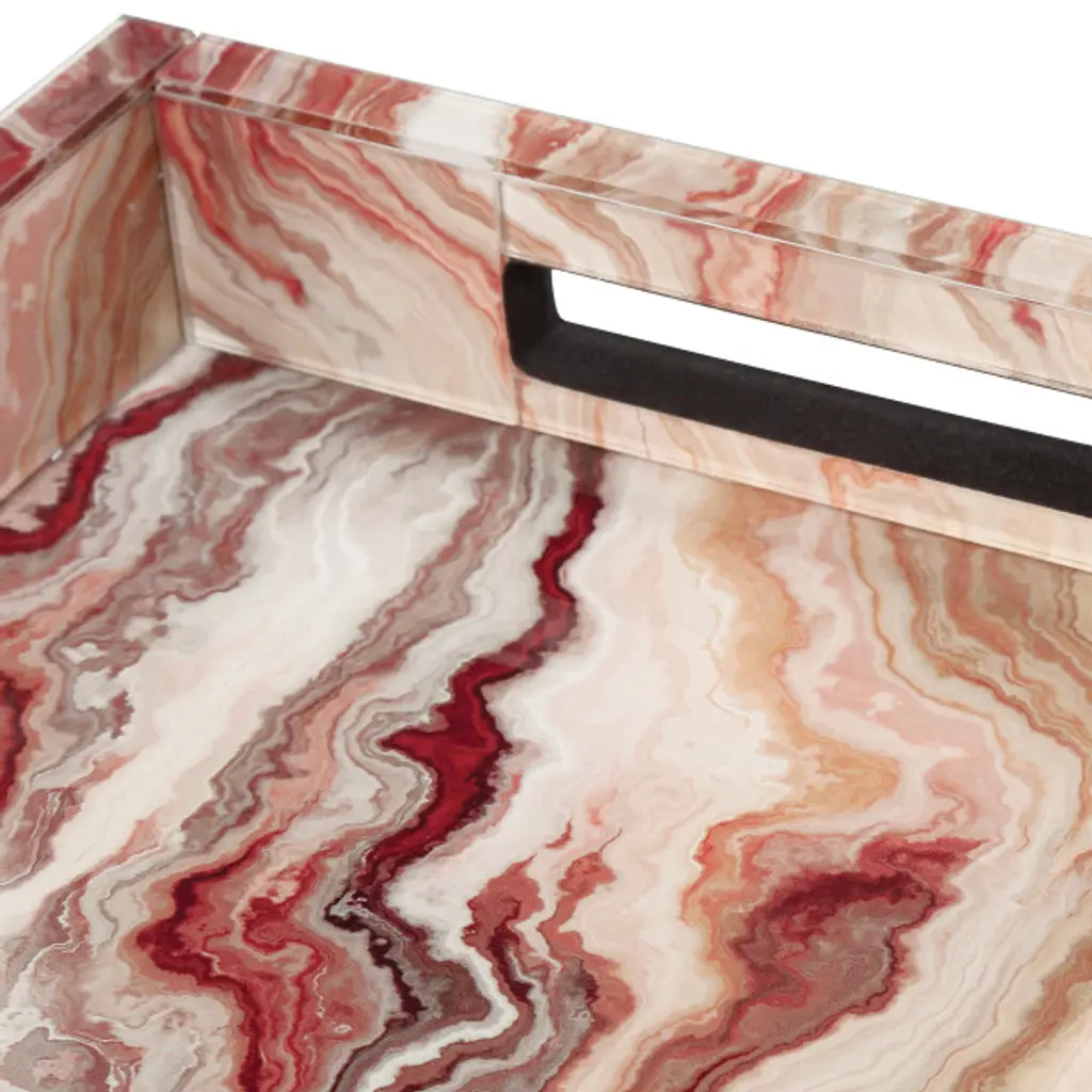The Interstellar Tray has a surprising secret: it is not made of a dynamically patterned stone; its surface was created when red swirl paper was encased in glass. The coating brings the decorative tray an unparalleled sheen. The interiors of the handles are covered in black felt and the bottom is covered in foam. Because this accessory is handmade, the patterns will vary.