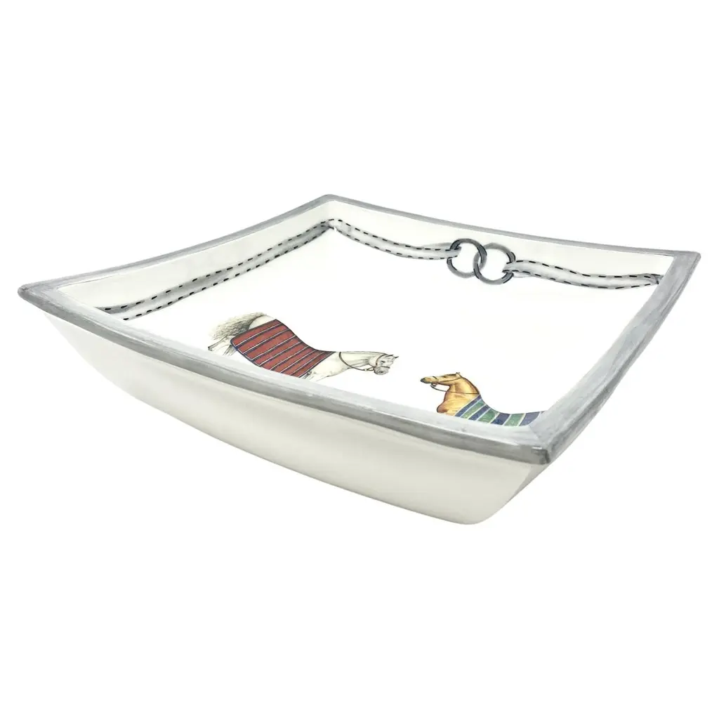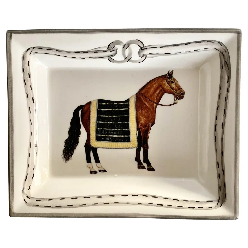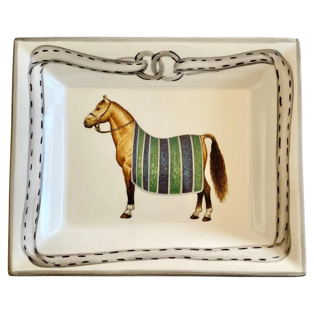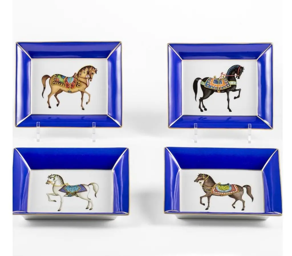 Italian craftsmanship pocket tray decorated with 4 different horses gold and blue border. Entirely made in Florence by our master craftsmen.Artecornici design produces hand colored art prints, artisan frames, lightings, decorative accessories and furniture. All our products are designed and produced in Florence by Italian master craftsmen.