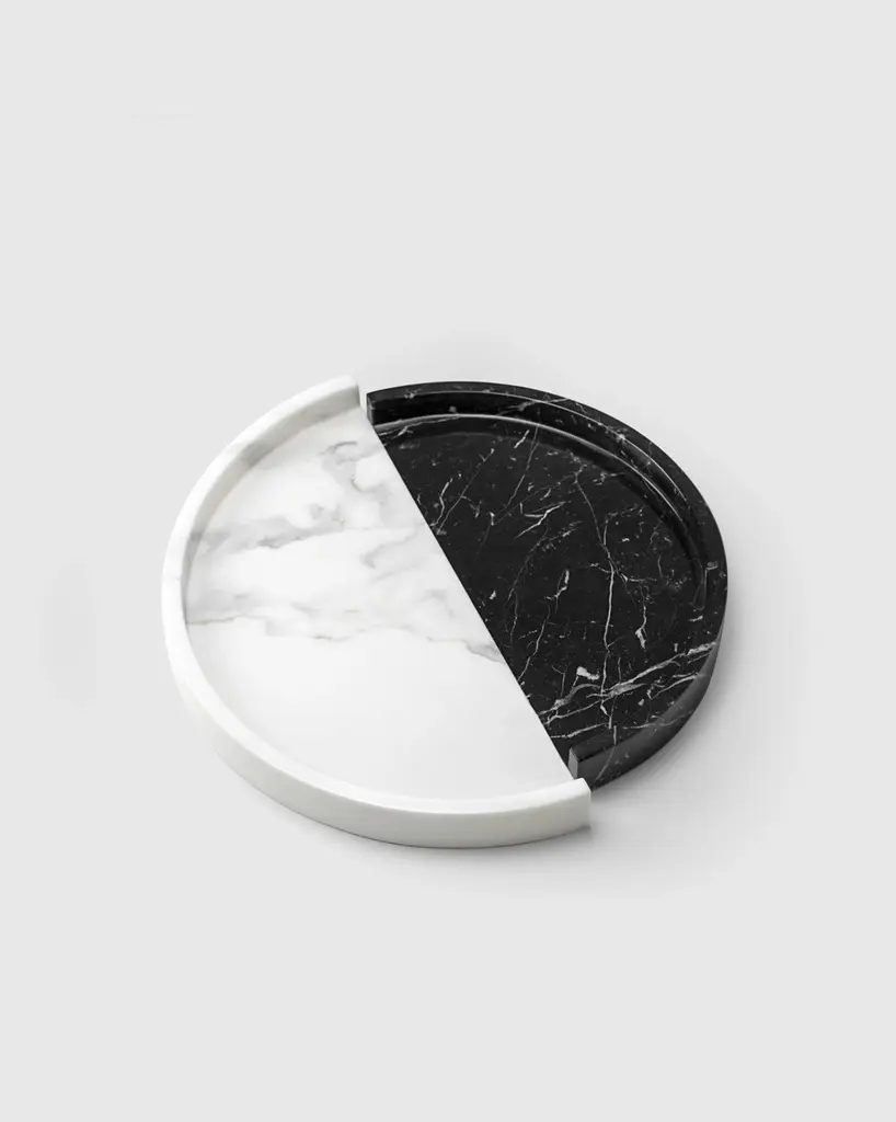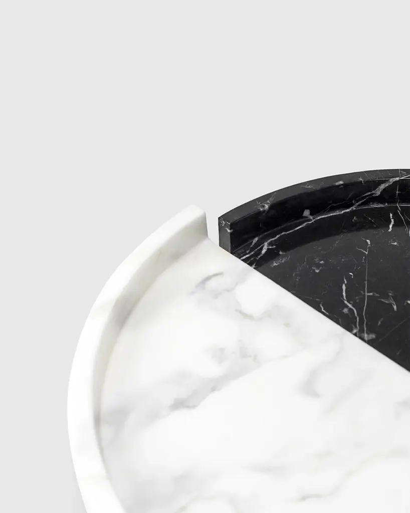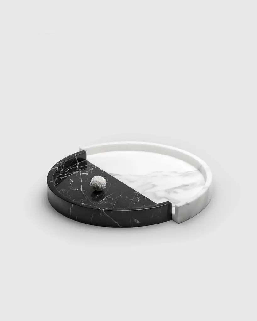 The "Mistake" tray is a playful and elegant marble piece that embraces the beauty of imperfection. Hand-crafted by skilled artisans in Tuscany, Italy from black Spanish “nero marquiña” and white Italian Statuario marbles, this tray features a distinctive design where two halves appear mismatched, creating a captivating visual effect. The seemingly incorrect pairing of the two parts reveals the tray’s inner section, a normally hidden feature.Its minimalist design and the choice of premium natural materials make it a versatile piece for any environment. – from modern living rooms to chic office spaces. Ideal for design enthusiasts, this tray makes a thoughtful and stylish gift. Its unique design and concept will captivate guests and spark interesting conversations. Use it to display candles, objects, jewelry, or as a chic serving tray for special occasions.Order now and add a touch of understated sophistication to your space. Numbered series, comes with certificate of authenticity. As seen in “Ignant” and "Minimalissimo" publications.