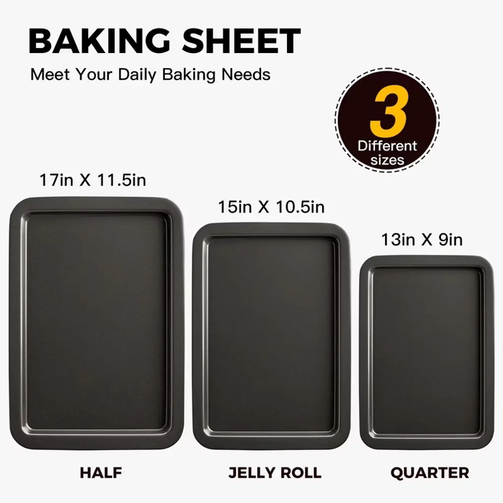 Upgrade your baking experience with this premium baking sheet pan set. Crafted from carbon steel, it's sturdy, durable, and healthier than aluminum. Unlike glass or ceramic, it won't break. The set features three different pans, ideal for baking biscuits, bread, vegetables, or meat, and can even double as a tray, meeting all your family's baking needs. It can be safely used in an oven up to 450°F with even heat distribution and anti - warping properties. The one - piece seamless design with rounded corners enhances safety. The stackable trays save space, and the wide - sided design makes them easy to hold. The high - quality non - stick coating ensures perfect food release and easy cleaning, and it's dishwasher - safe. With its simple design and great versatility, this set is a must - have for any kitchen.
