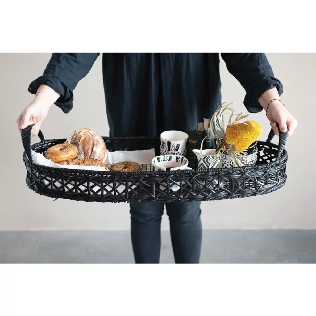 These trays are perfect for kitchens, coffee tables and entryways. Hand-woven, these trays are made out of rattan and feature a simple black color that will match with anything. Perfect for filling with decorative books, keys and other personal belongings, and small plants.