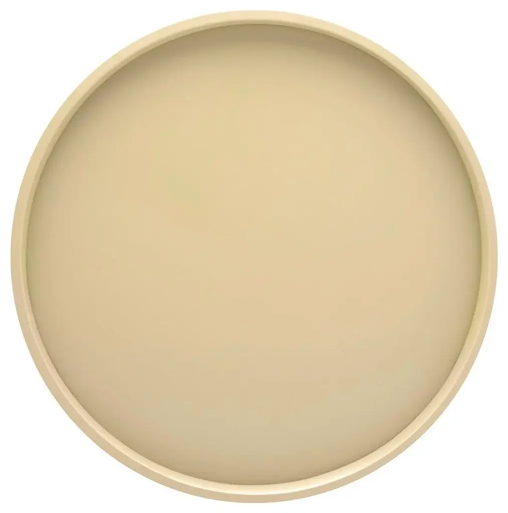 Ivory 14" Round Serving TrayOur 14" Round Serving Tray features a 1.5" Gallery and is completely covered in the specific color that matches this category. Easily capable of carrying 4 Glasses and Ice Bucket, this tray will make being the perfect hostess that much easier. Our Fun Colors Collection features the hottest colors for the season, to provide you with great entertaining items, with up to the minute styling. Great for indoor and outdoor entertaining.Vinyl Surface is easy to wipe clean.14" Size makes serving a breeze with this tray.Color Matched to all other items in this category1.5 Inch rim prevents items from falling off inadvertently.