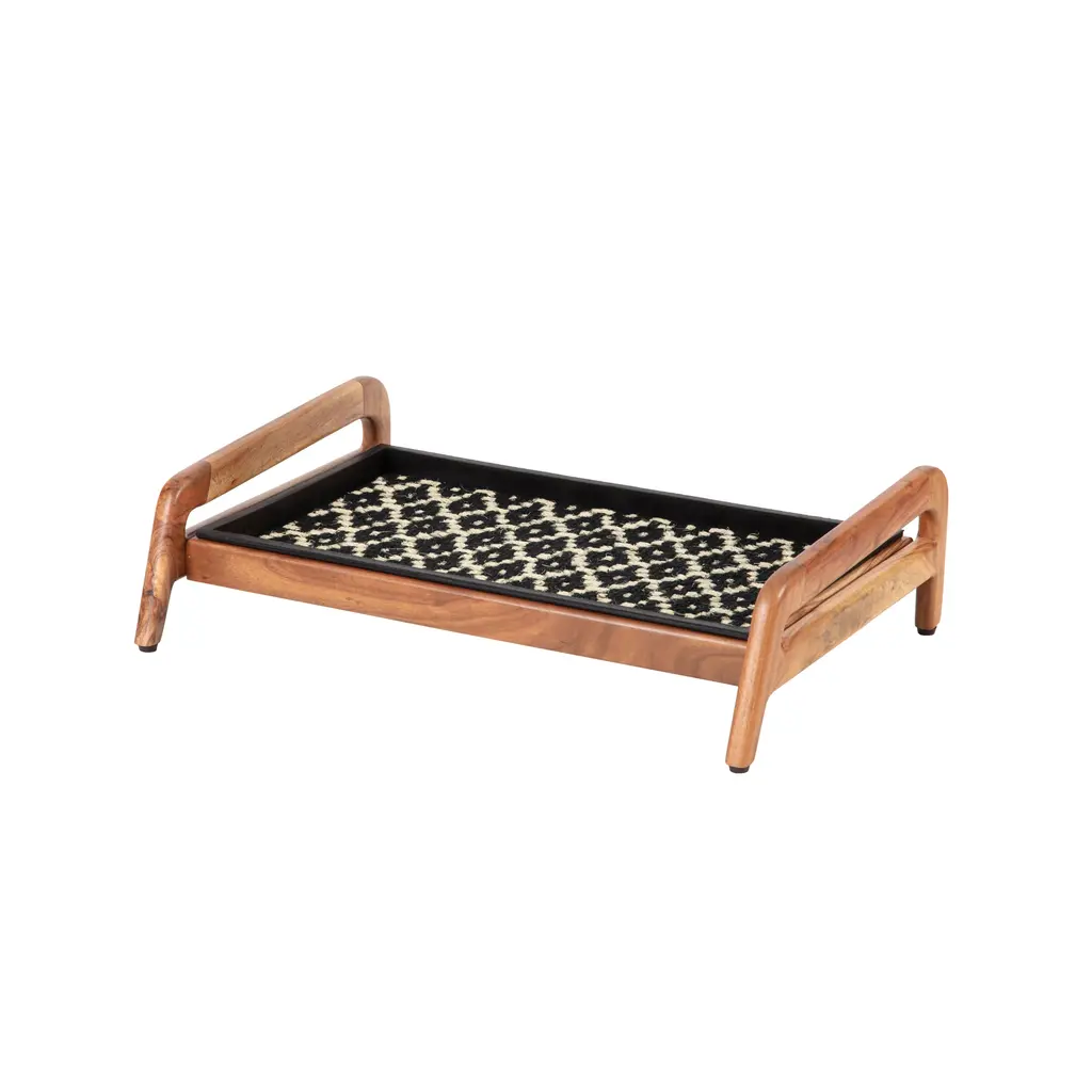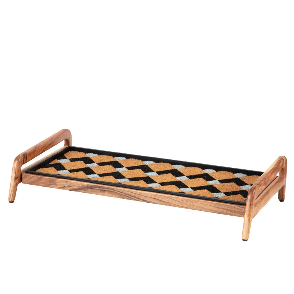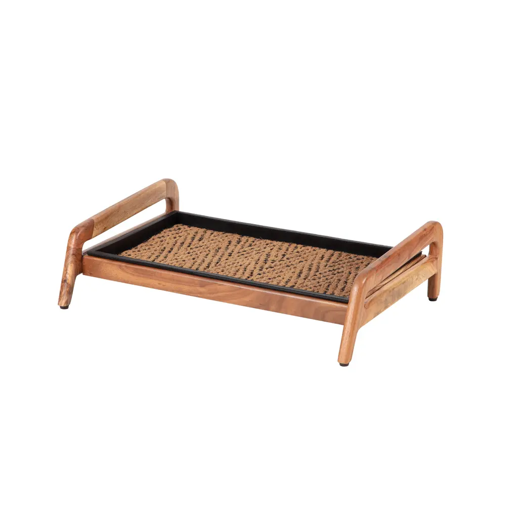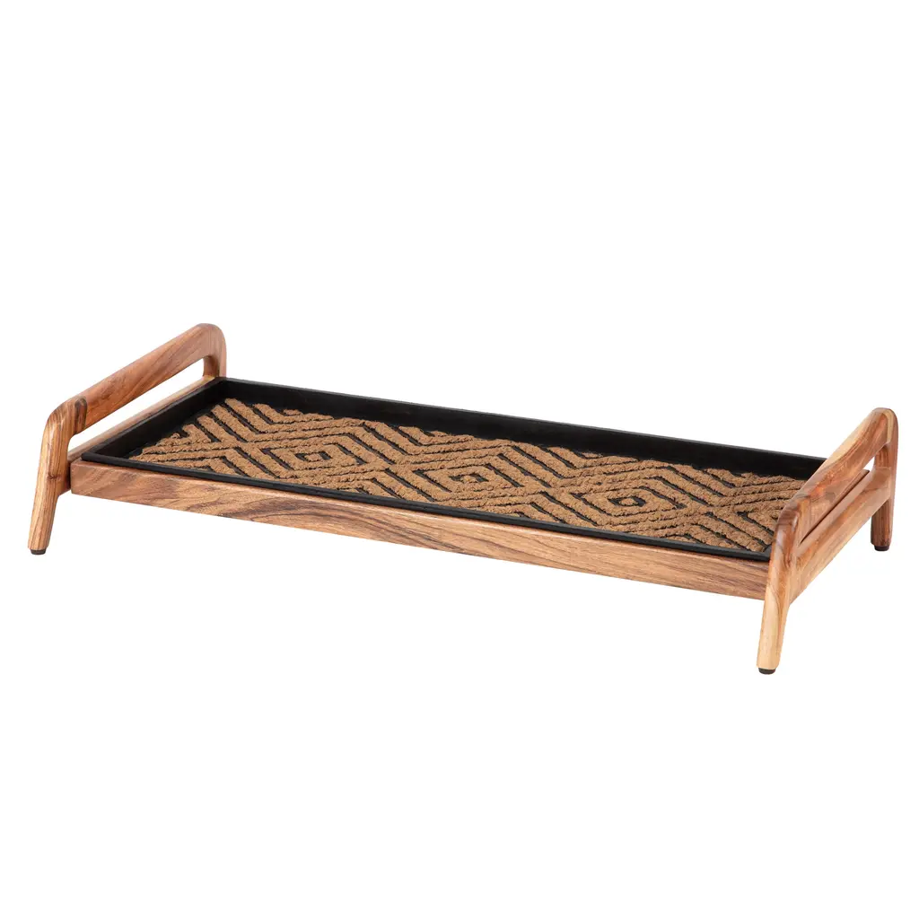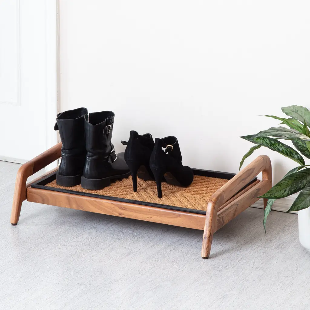 Influenced by mid-century modern style and mindfully designed to be durable, our Jani Single-Tier Natural Stand 2-Pair Rubber Boot Tray is the ideal solution for your clutter-free entryways. Easy to care for, the stand is made using high-quality solid wood that withstands the test of time. Accompanied by a heavy-duty rubber tray with a classic scroll design for quick drying, you also get a diverse collection of easily removable coir inserts to choose from. Standing on tapered legs and bearing a neutral color tone throughout, the raised rim helps to contain spills, keeping your entryway clean and organized.Features:
