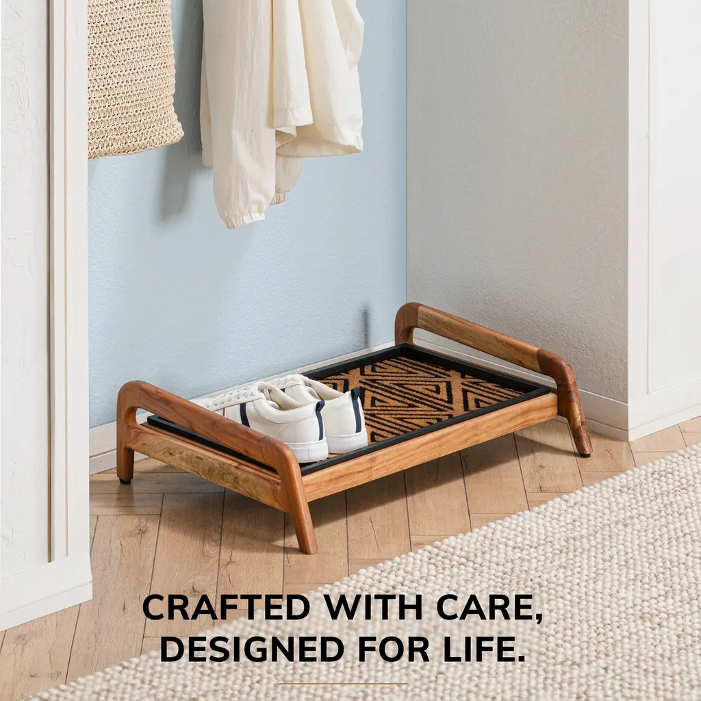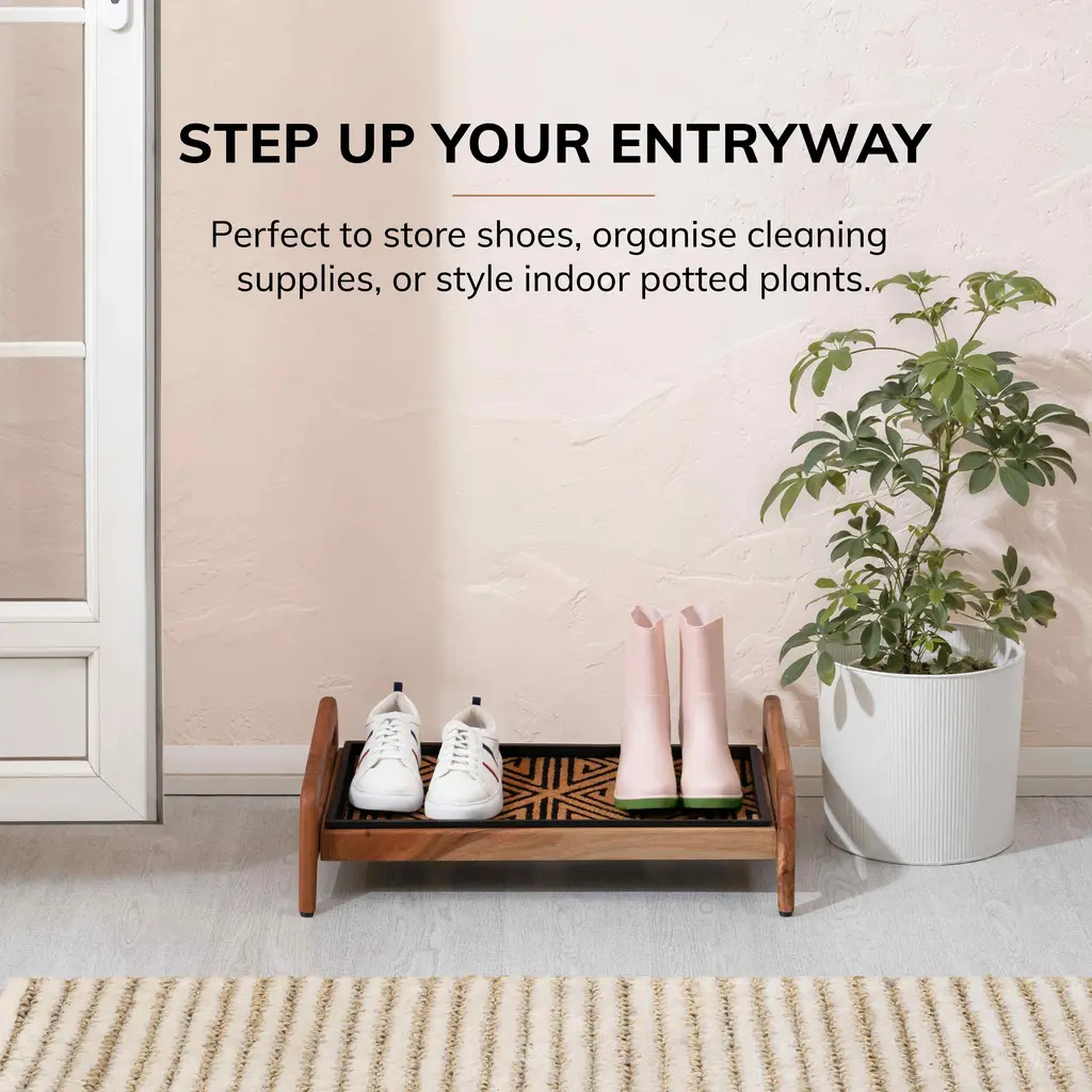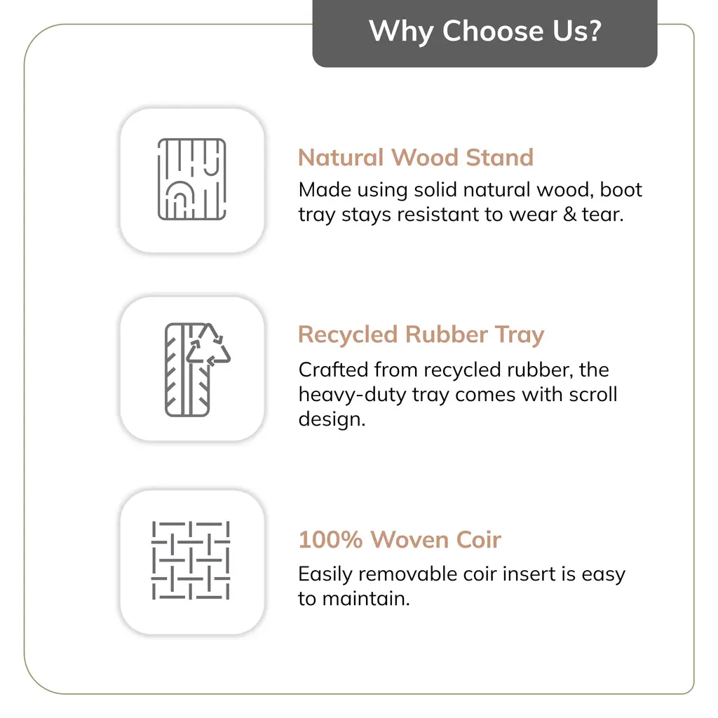 Influenced by mid-century modern style and mindfully designed to be durable, our Jani Single-Tier Natural Stand 2-Pair Rubber Boot Tray is the ideal solution for your clutter-free entryways. Easy to care for, the stand is made using high-quality solid wood that withstands the test of time. Accompanied by a heavy-duty rubber tray with a classic scroll design for quick drying, you also get a diverse collection of easily removable coir inserts to choose from. Standing on tapered legs and bearing a neutral color tone throughout, the raised rim helps to contain spills, keeping your entryway clean and organized.Features: