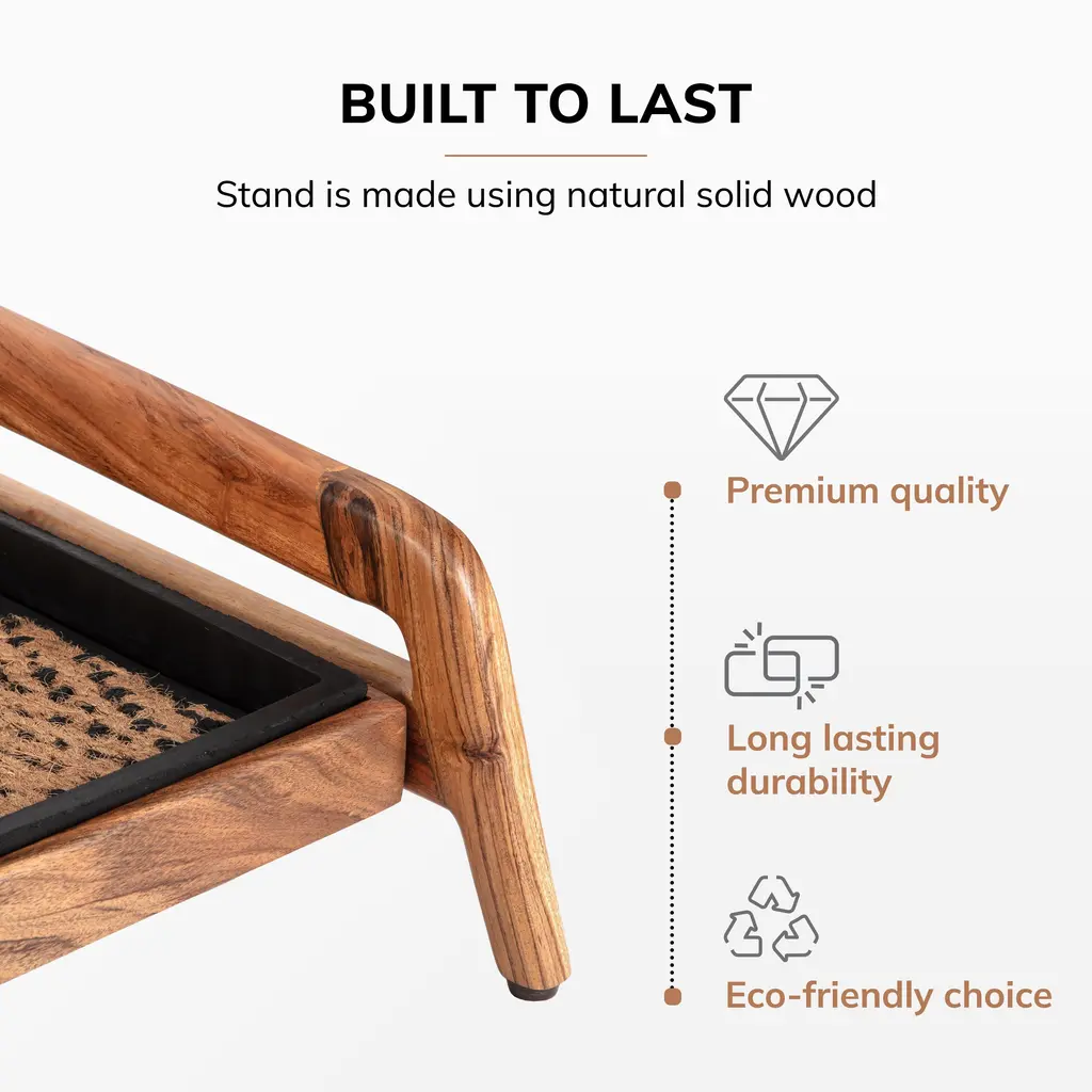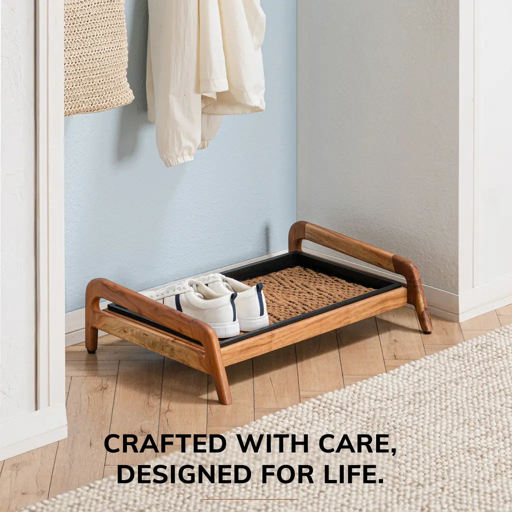 Influenced by mid-century modern style and mindfully designed to be durable, our Jani Single-Tier Natural Stand 2-Pair Rubber Boot Tray is the ideal solution for your clutter-free entryways. Easy to care for, the stand is made using high-quality solid wood that withstands the test of time. Accompanied by a heavy-duty rubber tray with a classic scroll design for quick drying, you also get a diverse collection of easily removable coir inserts to choose from. Standing on tapered legs and bearing a neutral color tone throughout, the raised rim helps to contain spills, keeping your entryway clean and organized.Features: