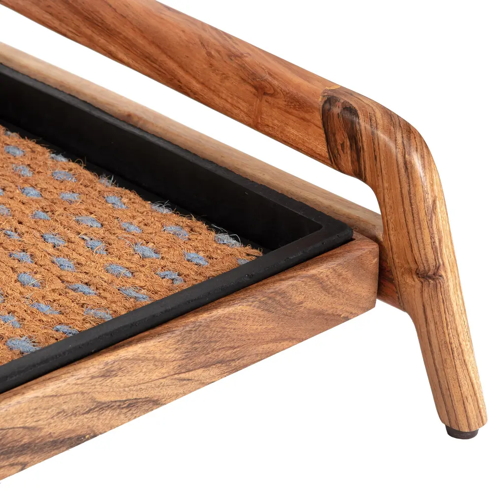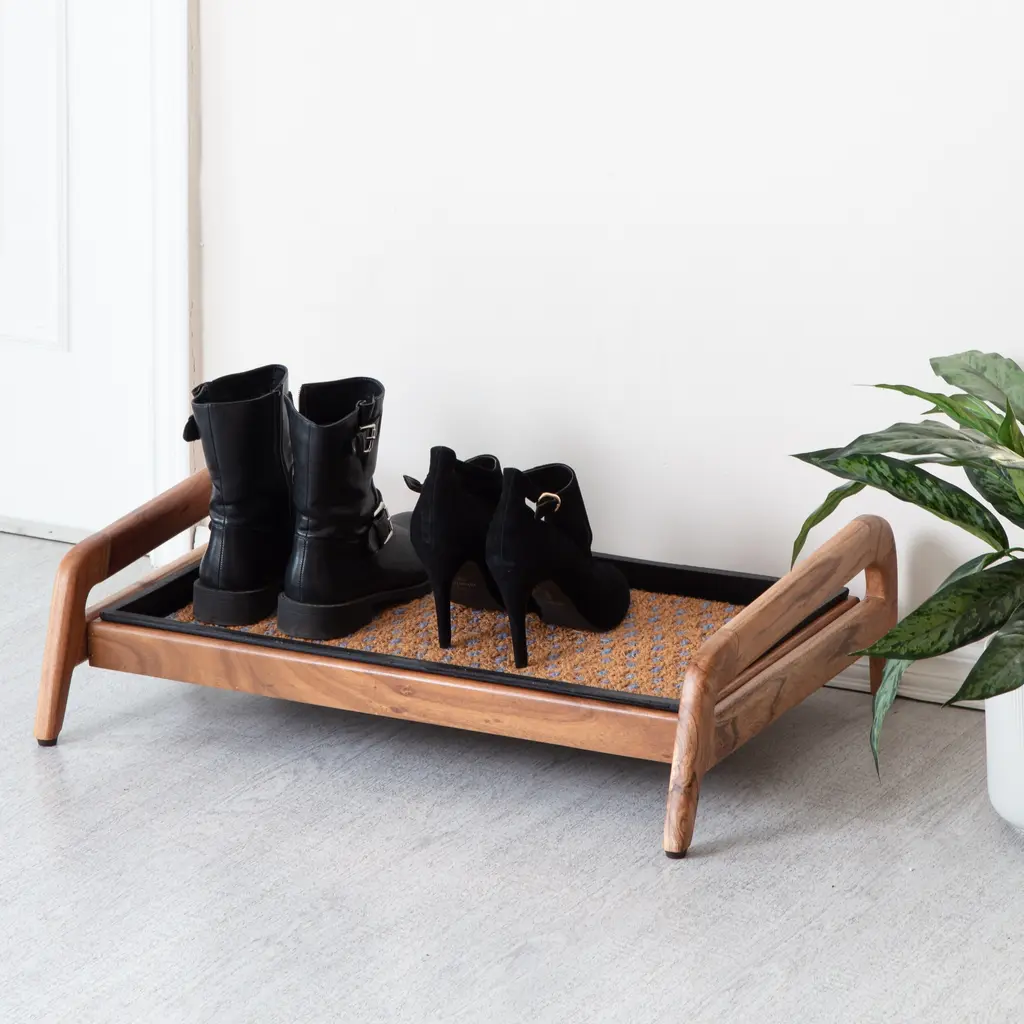 Influenced by mid-century modern style and mindfully designed to be durable, our Jani Single-Tier Natural Stand 2-Pair Rubber Boot Tray is the ideal solution for your clutter-free entryways. Easy to care for, the stand is made using high-quality solid wood that withstands the test of time. Accompanied by a heavy-duty rubber tray with a classic scroll design for quick drying, you also get a diverse collection of easily removable coir inserts to choose from. Standing on tapered legs and bearing a neutral color tone throughout, the raised rim helps to contain spills, keeping your entryway clean and organized.Features: