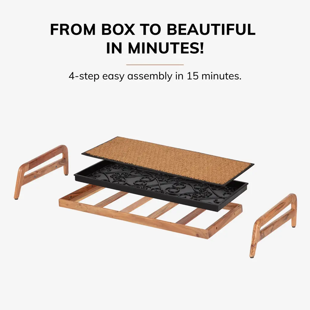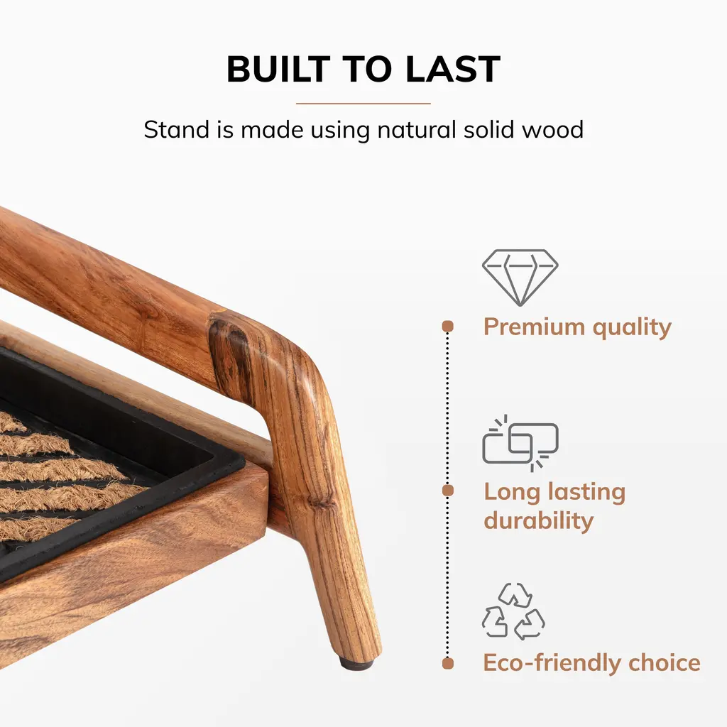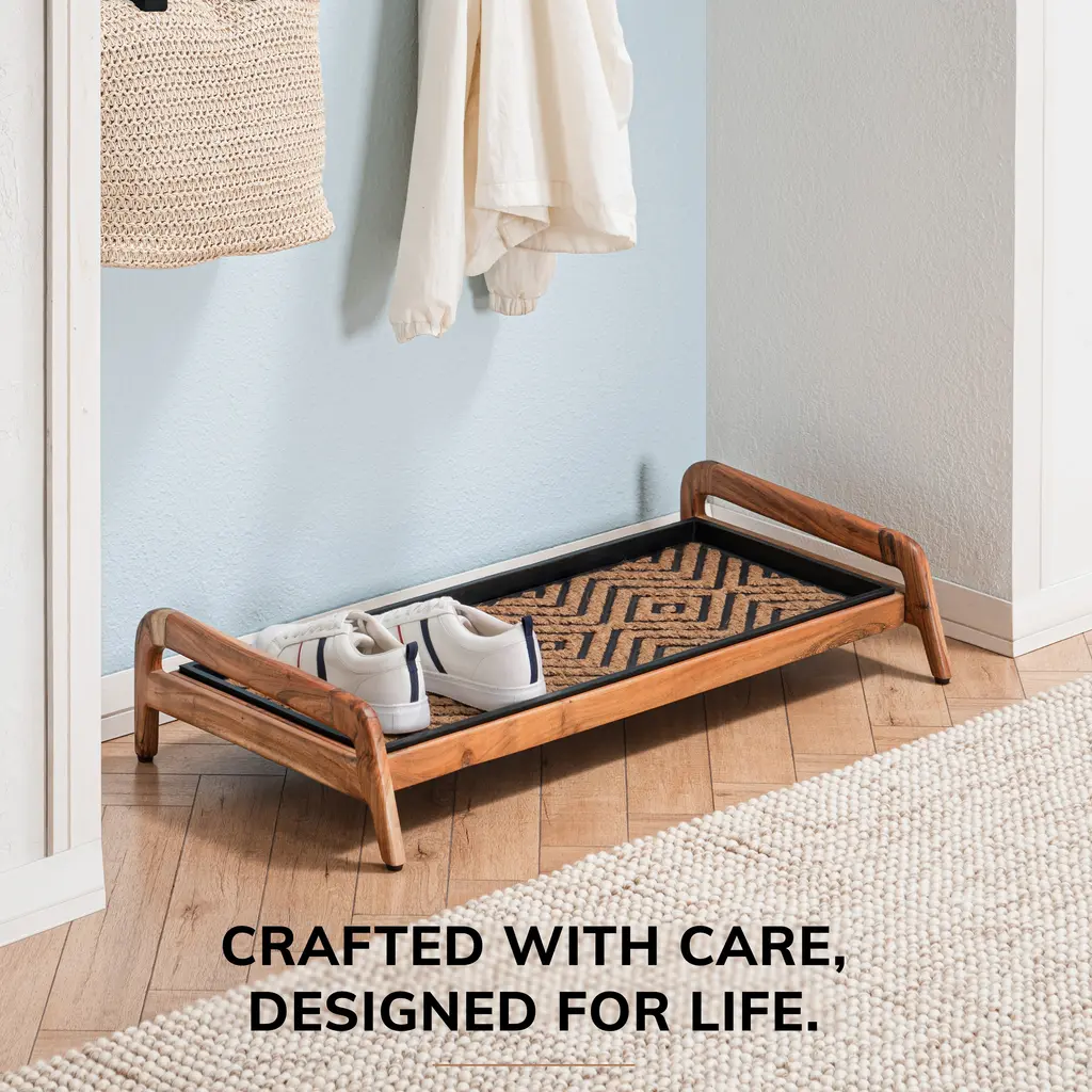 Influenced by mid-century modern style and mindfully designed to be durable, our Jani Single-Tier Natural Stand 3-Pair Rubber Boot Tray is the ideal solution for your clutter-free entryways. Easy to care for, the stand is made using high-quality solid wood that withstands the test of time. Accompanied by a heavy-duty rubber tray with a classic scroll design for quick drying, you also get a diverse collection of easily removable coir inserts to choose from. Standing on tapered legs and bearing a neutral color tone throughout, the raised rim helps to contain spills, keeping your entryway clean and organized.Features: