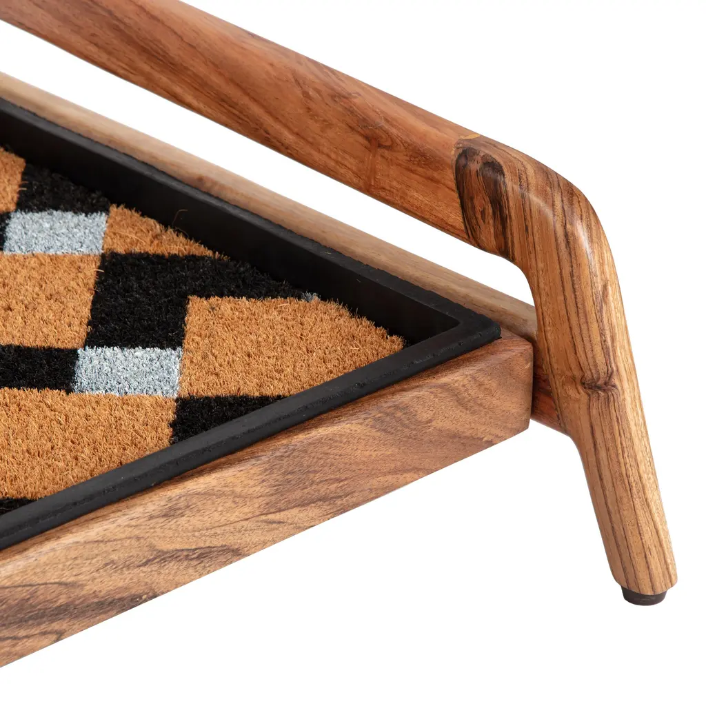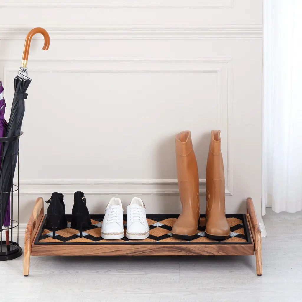 Influenced by mid-century modern style and mindfully designed to be durable, our Jani Single-Tier Natural Stand 3-Pair Rubber Boot Tray is the ideal solution for your clutter-free entryways. Easy to care for, the stand is made using high-quality solid wood that withstands the test of time. Accompanied by a heavy-duty rubber tray with a classic scroll design for quick drying, you also get a diverse collection of easily removable coir inserts to choose from. Standing on tapered legs and bearing a neutral color tone throughout, the raised rim helps to contain spills, keeping your entryway clean and organized.Features: