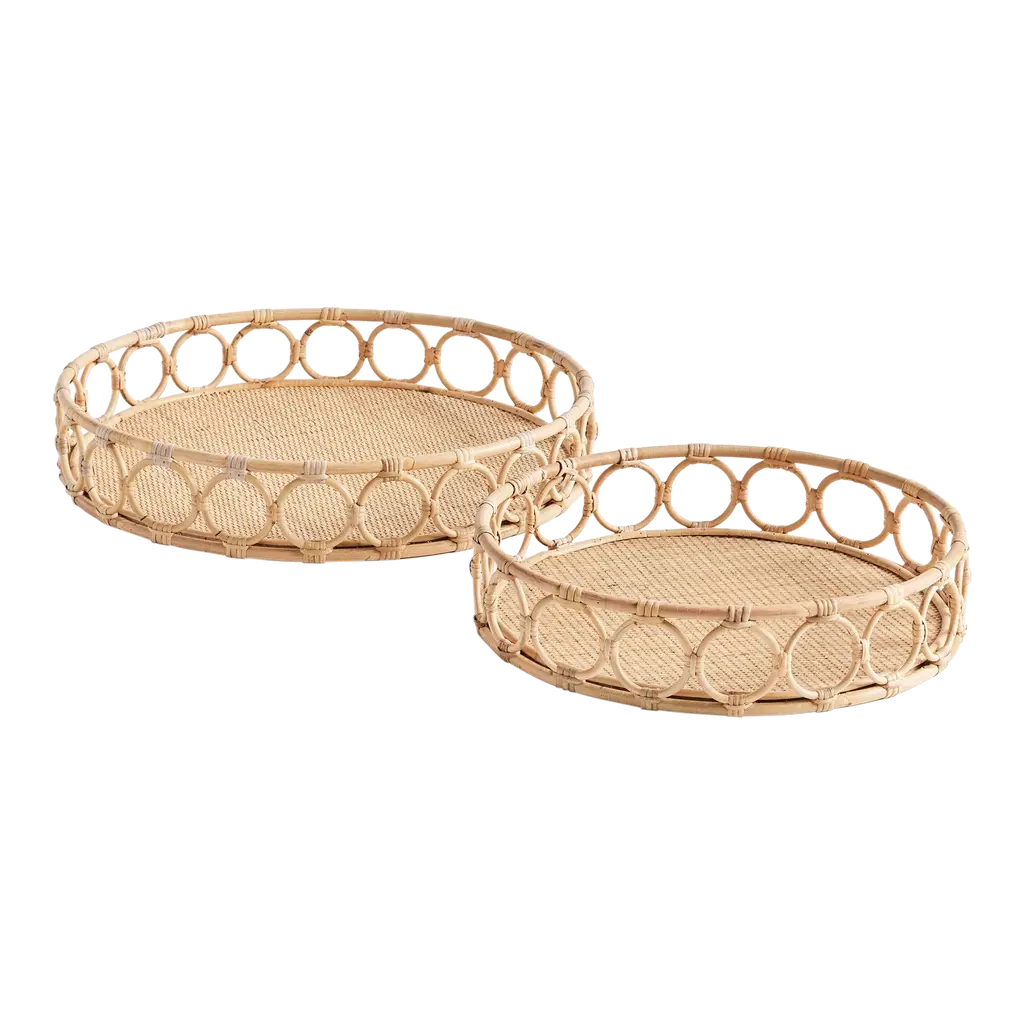This exquisite set of Jelani cane trays are truly high end. Cane rattan is bent by hand and inlaid by highly skilled artisans, While they make nice serving trays, their craftsmanship also makes them perfect for unexpected wall displays. Beautiful on ottoman or even hung on the wall. Highly skilled artisan-made.Size: Set of 2 included: 23.5 x 23.5 x 2.25 inches and 19.75 x 19.75 x 2.25 inchesCare: Interior use only. Dust with soft cloth. Do not use harsh chemicals.