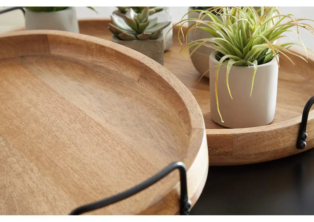 Serve it up in style. Whether reserved for special gatherings or part of your everyday table display, the Jocelyne set of wood and metal trays is loaded with rustic charm and chic character. Weight 8.000 lbs. (3.6kgs.)