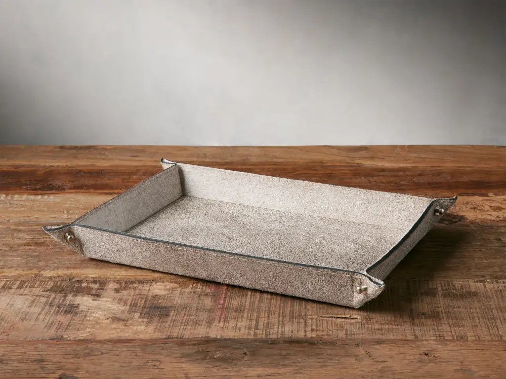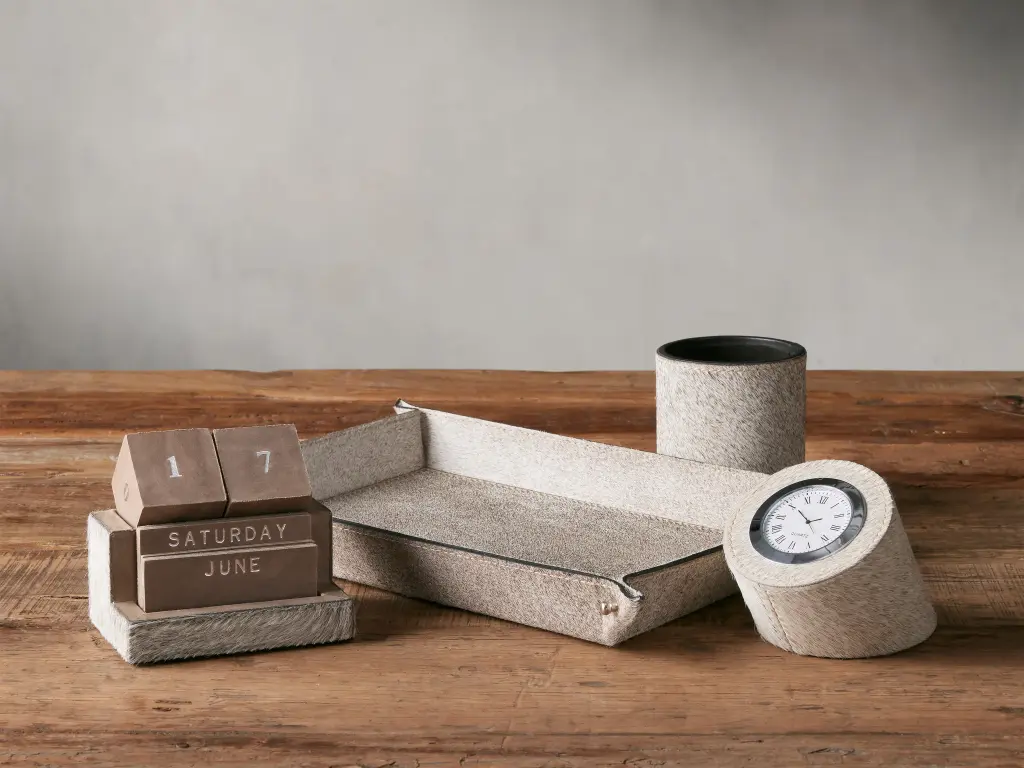 Wrapped in natural hair on hide, our Jones Desk Collection features rustic, organic style to complete your home office aesthetic. Stylish décor yet functional accessory, each piece is handcrafted in India by master artisans with incredible attention to detail from the chosen hide pieces all the way to the stitched accents.