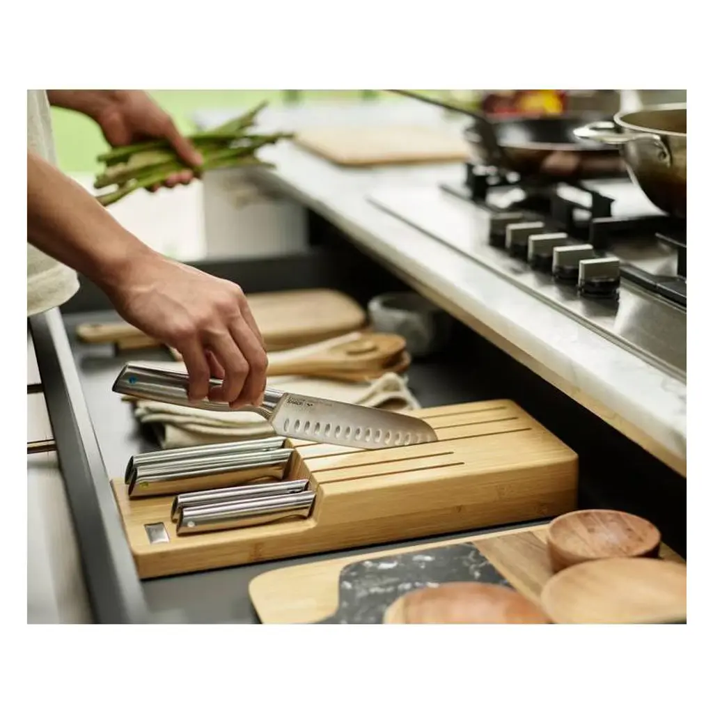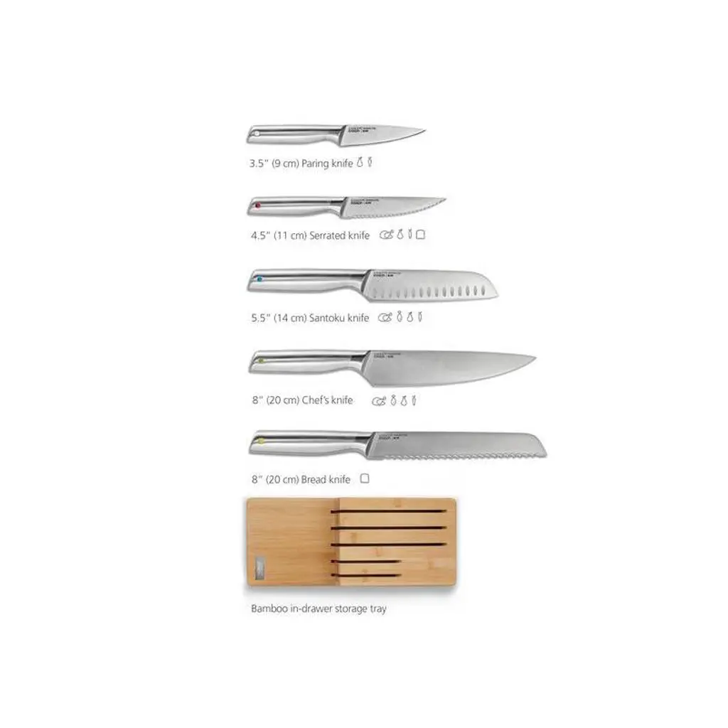 This stunning set features five knives with high-quality, Japanese stainless-steel blades and weighted, steel handles with integrated tool rests. These prevent the blades from touching the work surface when placed down, minimizing mess and improving hygiene. The set comes with a beautiful, bamboo in-drawer tray with non-slip feet for organized storage. The set includes a 3.5" (9 cm) Paring knife, 4.5" (11 cm) Serrated knife, 5.5" (14 cm) Santoku knife, 8" (20 cm) Chef's knife and an 8" (20 cm) Bread knife.
