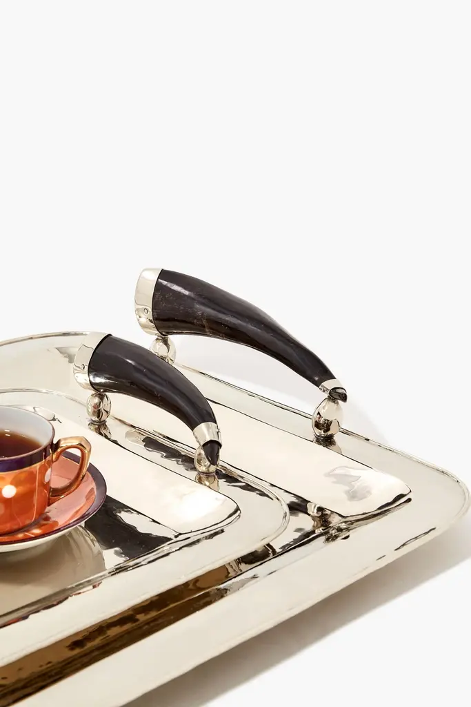 This family is created with the inspiration of the beautiful province of Jujuy, in the North of Argentina, and the nature of its fertile valley. It is the first line of our collection, and it includes trays, champagne buckets, pitchers and ice buckets, that are made of alpaca, goat horn and bone.Our pieces are made by hand. One of a kind.All natural stones may vary in color.