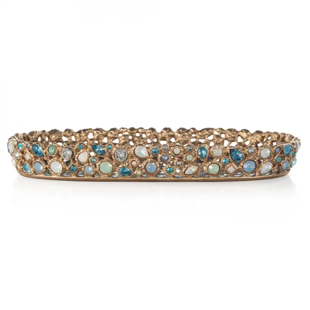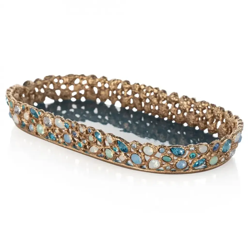 Evoke the mesmerizing sparkle of sunshine on the sea with this enchanting and aquamarine tray. Surrounded by 122 crystals in soothing marine hues set into a golden lattice frame, this piece channels a luxurious seaside vacation; the tranquility of the ocean with a touch of tasteful glamour.