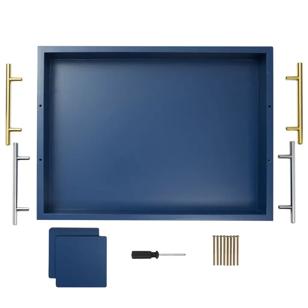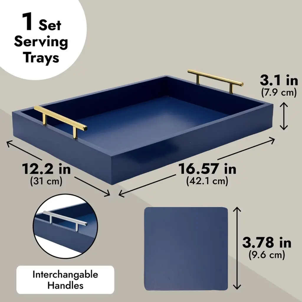 Our lightweight wooden coffee serving tray is ideal for serving food and drinks to guests, breakfast in bed, or organizing small household items around the home. The rectangular serving tray is perfectly sized to organize and transport dishes, silverware, magazines, newspapers, flowers, video game controllers, chargers, wallets, TV remotes, or decorative items. Its clean finish adds a fresh and contemporary touch to any room. The minimalist design effortlessly blends with various décor styles, making it a versatile addition to your home. Interchangeable handles let you customize it to fit the occasion. The included coasters provide a practical solution for safeguarding your table from spills and stains while adding a refined finishing touch. Add this to your collection of serving trays, or gift it to a coworker or loved one for a wedding or housewarming party. Transform your space with interchangeable handles, protect your table with included coasters, and enjoy a modern and elegant focal point that elevates your home décor. More Color Available.
