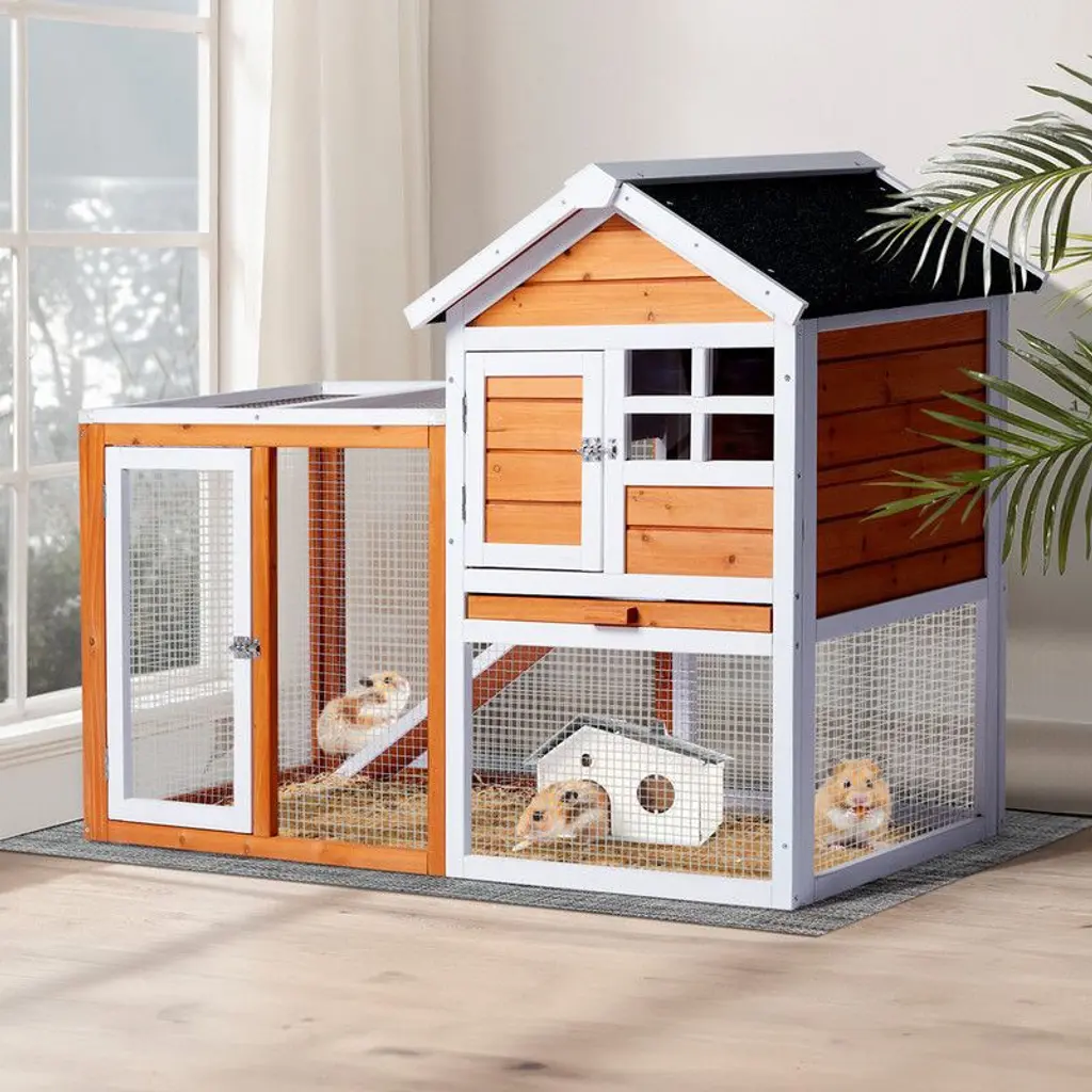 Constructed from solid fir wood and heavy-duty galvanized wire mesh, it provides a sturdy, safe, and non-toxic home for bunnies, guinea pigs, ferrets, hamsters, and other small animals. Featuring a removable pull-out upper tray for effortless cleaning and a waterproof roof to withstand both outdoor and indoor environments, this hutch ensures your pets stay dry, comfortable, and secure.