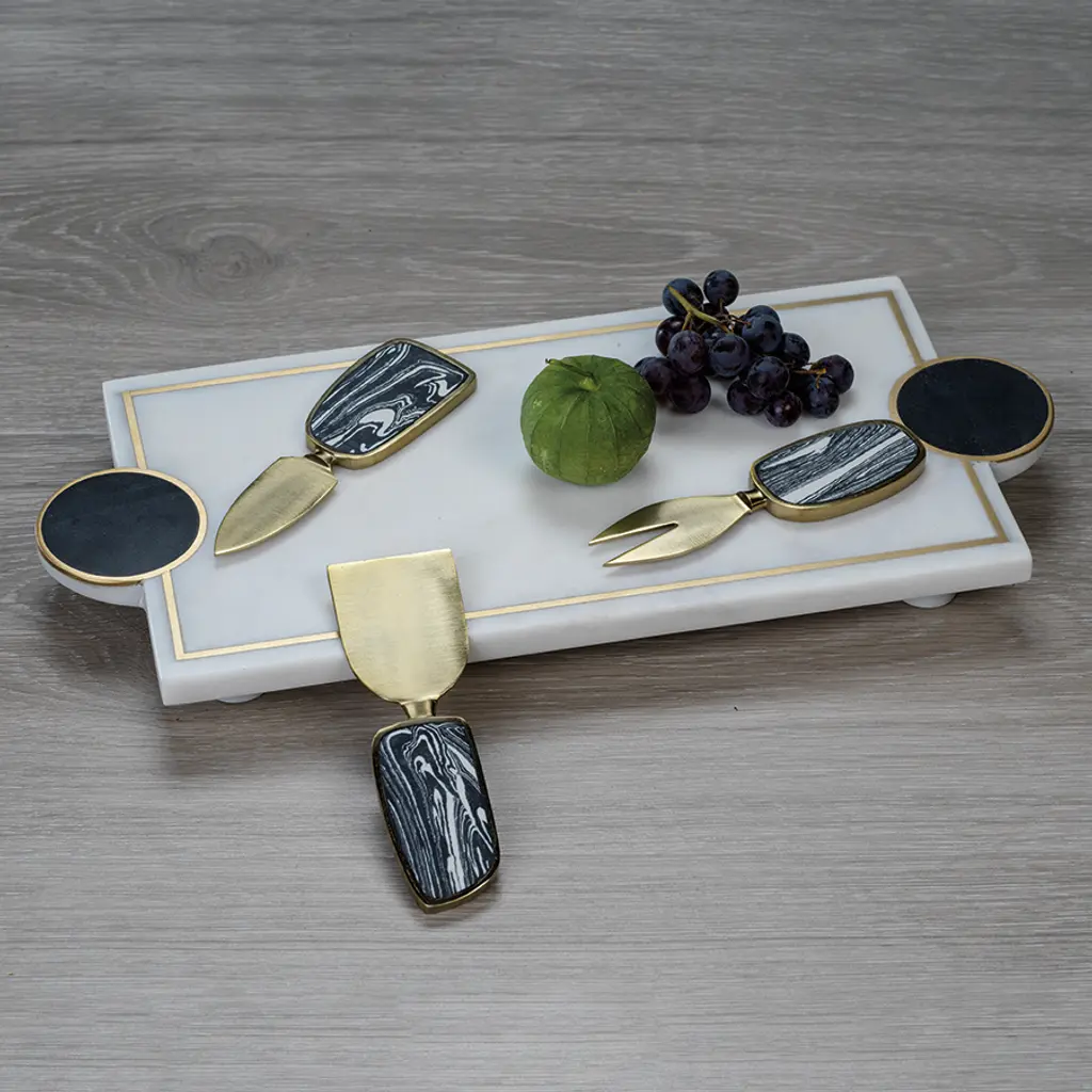 Polished white marble makes a bright and elegant base for presenting appetizers at the buffet table or home bar. The simple design of this footed tray highlights the beauty of the durable stone. Made from marble with kadappa stone handles , this stylish serving board fits everything from meat and cheese spreads to appetizers and snacks. Entertain in style Natural white marble with brass inlay Kadappa stone with brass trim edge side handles. Propped up on four cylinder feet. Natural material, slight variance in appearance may occur. Care Instructions: Wipe with damp cloth