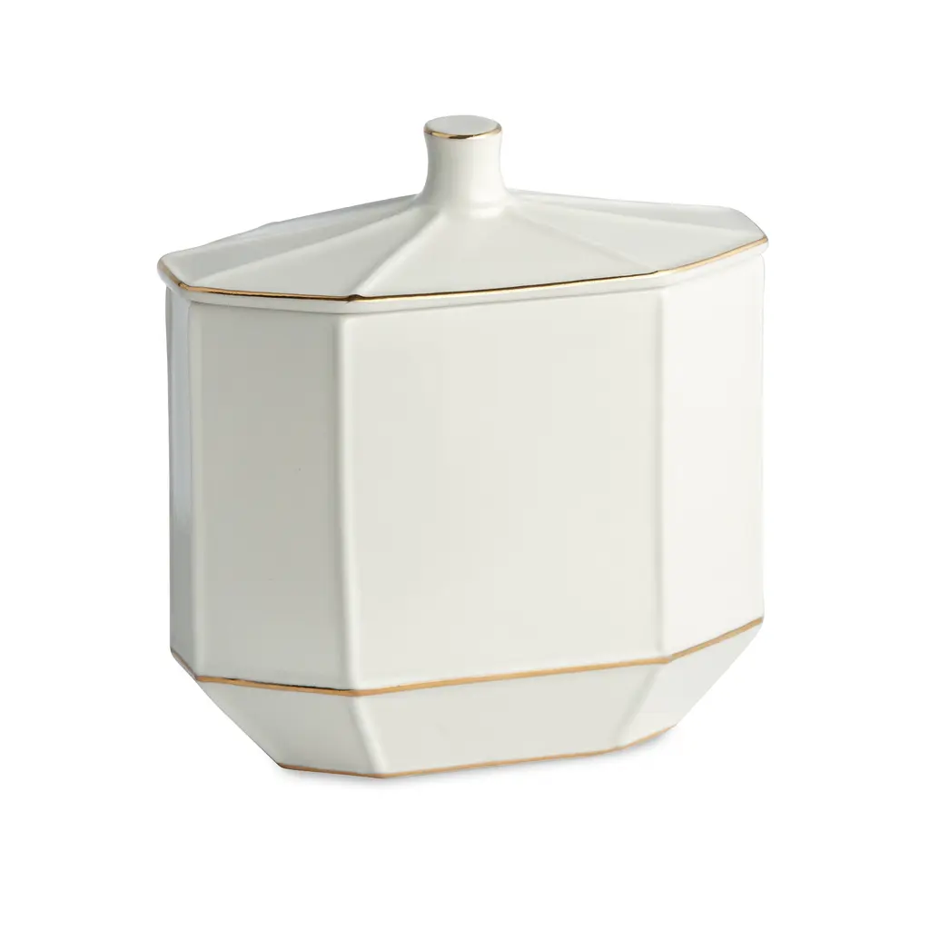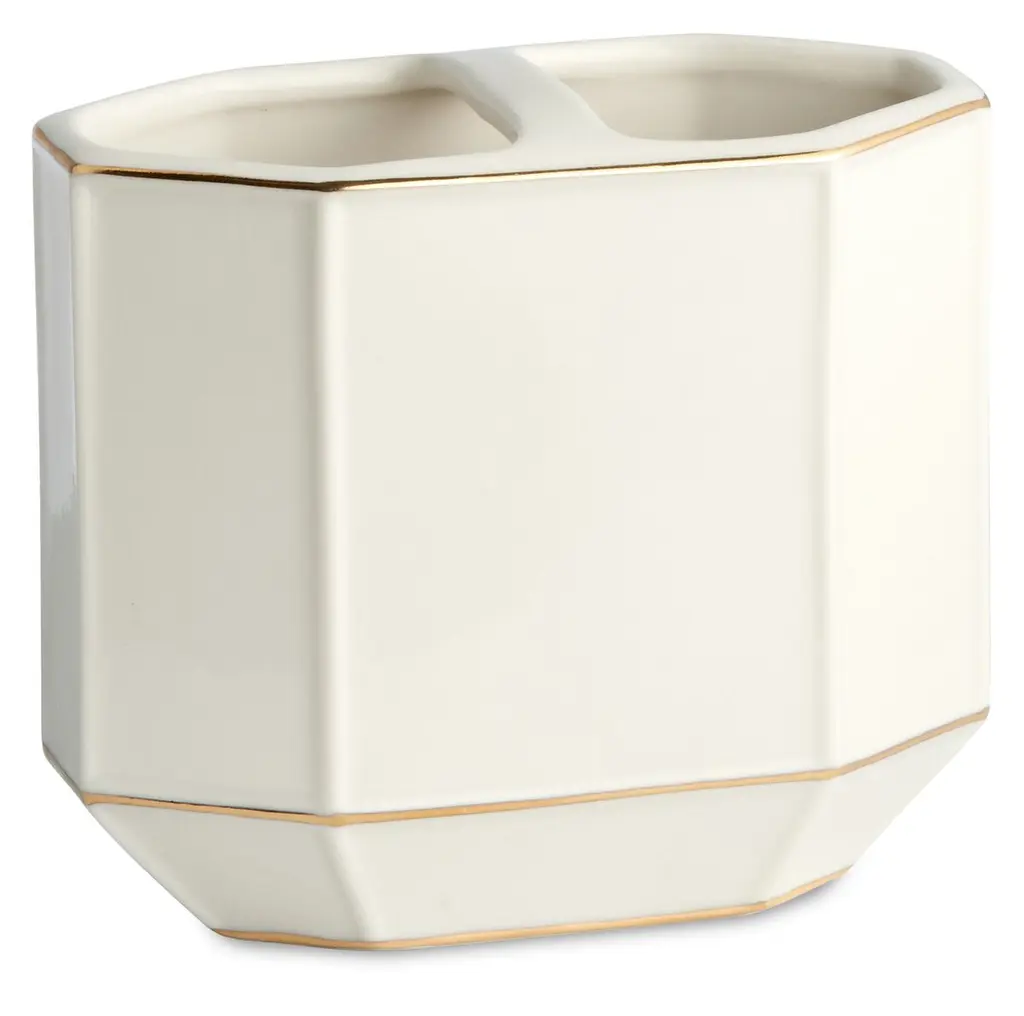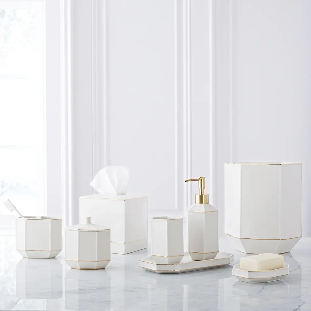 Bring exceptional sophistication to your bathroom with the Montepellier bath accessory collection. The solid porcelain accessories feature clean geometric lines and elegant gold trim details. Choose from individual pieces including a lotion dispenser, soap dish, tumbler, cotton jar, tissue cover, toothbrush holder, tray, and waste basket to complete your bathroom decor.Features:Dimensions: