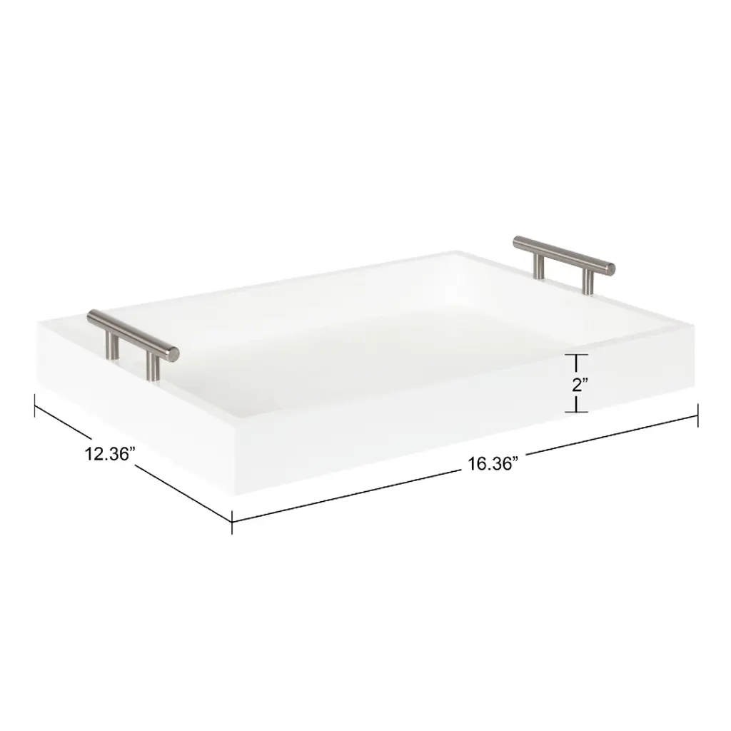 Bring contemporary glam style into your home with this decorative accent tray with polished metal handles. Place this sophisticated accessory on your entrance console table as a place for trinkets or to hold your keys and mail as you come and go. The rectangular shape is spacious enough to hold documents or file folders on a home office desk adding a touch of bling to brighten up your workflow. Use it as a decorative accent on an ottoman to hold your beverages or on your vanity to organize your make up. Constructed of solid MDF wood with a high gloss finish and polished metal handles, it is sturdy enough to serve whatever fabulous cocktails you can make.