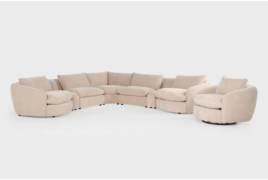 Kendall 159" Sand Beige Cloud-Like 7 Piece Curved L-Shaped Modular Sectional With Dual Wood Tray Storage Console & Swivel Cuddler
