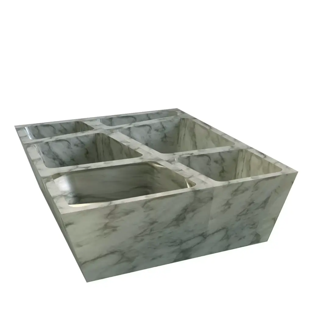 Kiru is a high-craftsmanship, versatile and multipurpose object made of Carrara marble. It is a pocket emptier, a bath or aperitif set. It is composed of six small irregular bowls that joined together to form a unicum. Elegant and functional, it embellishes a dining table, a console table or a countertop with its linear and strong personality.