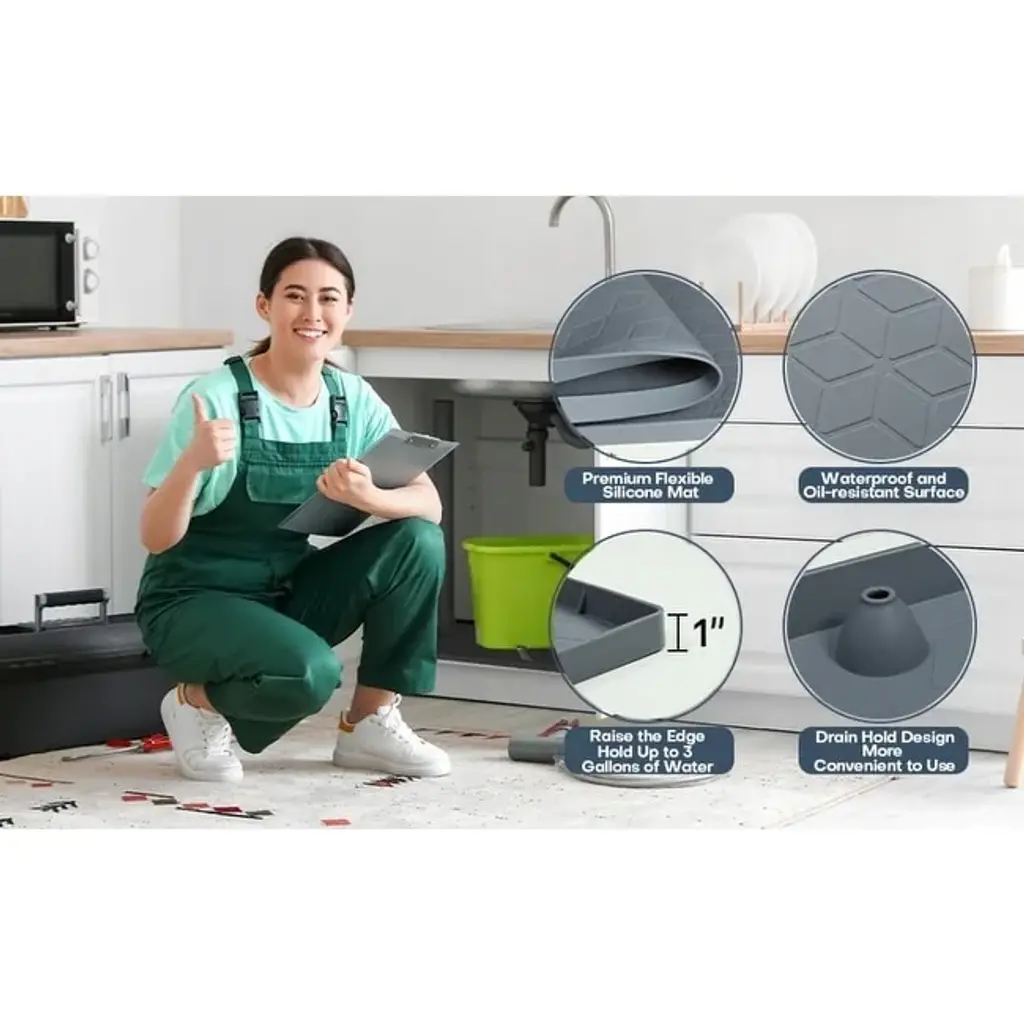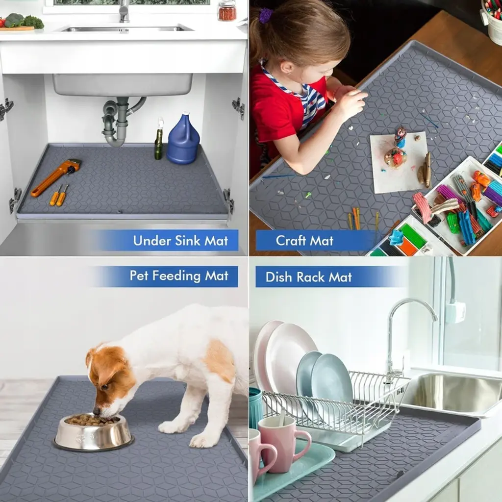 Say goodbye to the hassle of leaks and spills with LOCHAS Durable Sink Cabinet Shelf Liner. Specifically crafted to fit standard kitchen and bathroom cabinets, it's your ultimate defense against stains, scratches, and messes, ensuring your cabinets stay pristine for years. It's easy to install and customizable to fit your cabinets perfectly, it's the key to maintaining a clean and organized kitchen effortlessly.This Multi-functional Mat is not just a Under Sink Mat, it's also a Pets Feeding Mat, Craft Mat, Dish mat, Coffee Machine Mat, Kids Play Mat, Mud Shoes Mat, Umbrella Mat, and more! .Features: