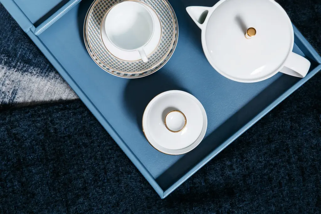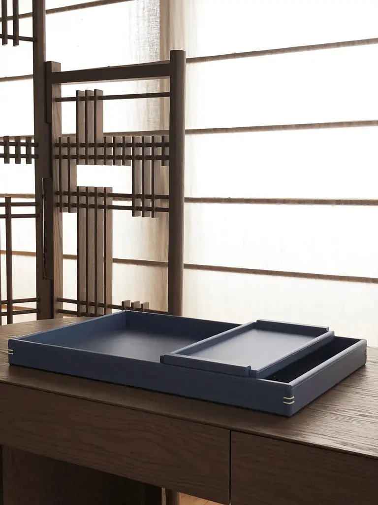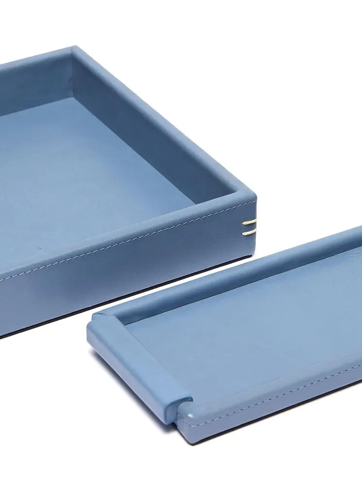 Knotted double leather serving tray set.Hand stitched calf leather.Also, available in a smaller size tray set of two, size 36.2 x 24.7 x 5.8 H cm. Larger quantities available upon request, with 8 weeks production time.Description: Knotted double leather tray set largeColor: BlueSize of Big Tray: 55 x 35 x 5.8 H cmSize of Small Tray: 17 x 35 x 2 H cmMaterial: LeatherCollection: Knotted.