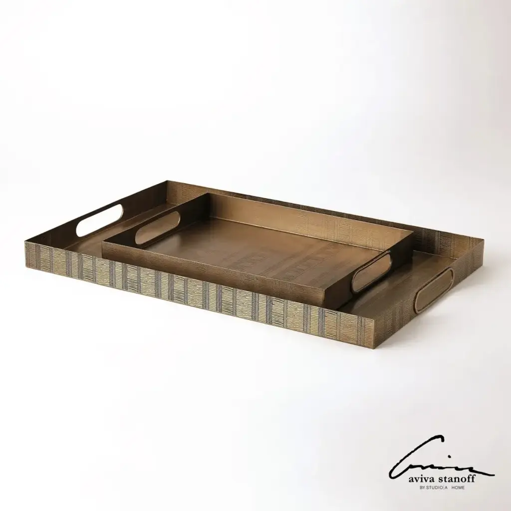 Kokoro means 'spirit' in Japanese. The lines of the Kokora Etched Boxes and Trays symbolize ones' journey with others in this life. The rectangular trays come in two sizes and two finishes - brass and nickel. From a fashion forward perspective, Global Views offers accessories, furniture, statement lighting, and an assortment of rugs and mirrors to add beauty and joy to your home.