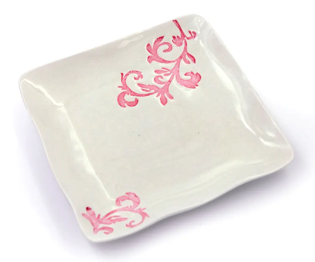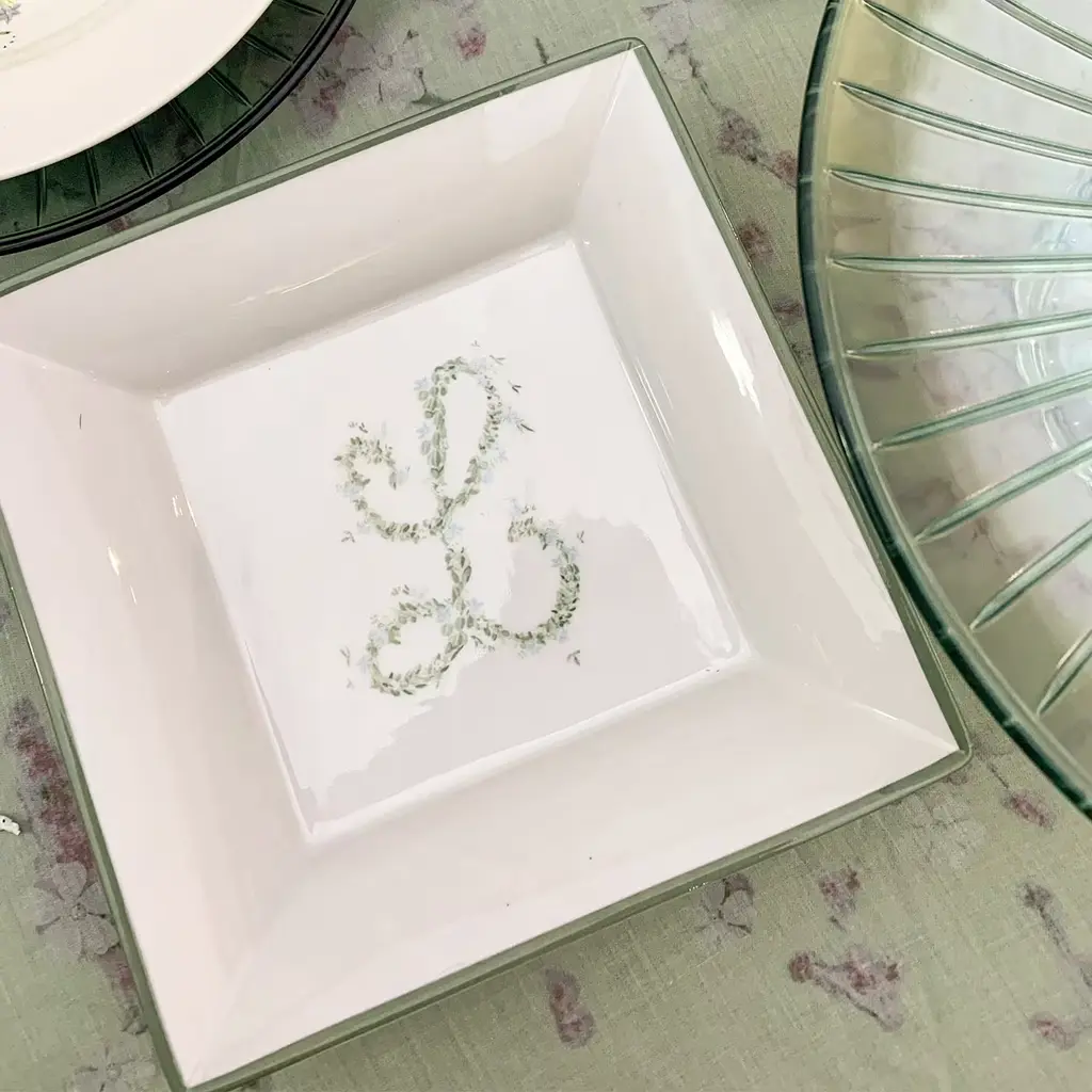 Synthesizing opulence and refinement, this square change tray - or ashtray - in first-rate white porcelain is superb for having keys and coins neatly within reach. The flowery cursive uppercase L painted in the center can be replaced at the customer's request, always encircled by the precious profile in pure gold accenting the rim.