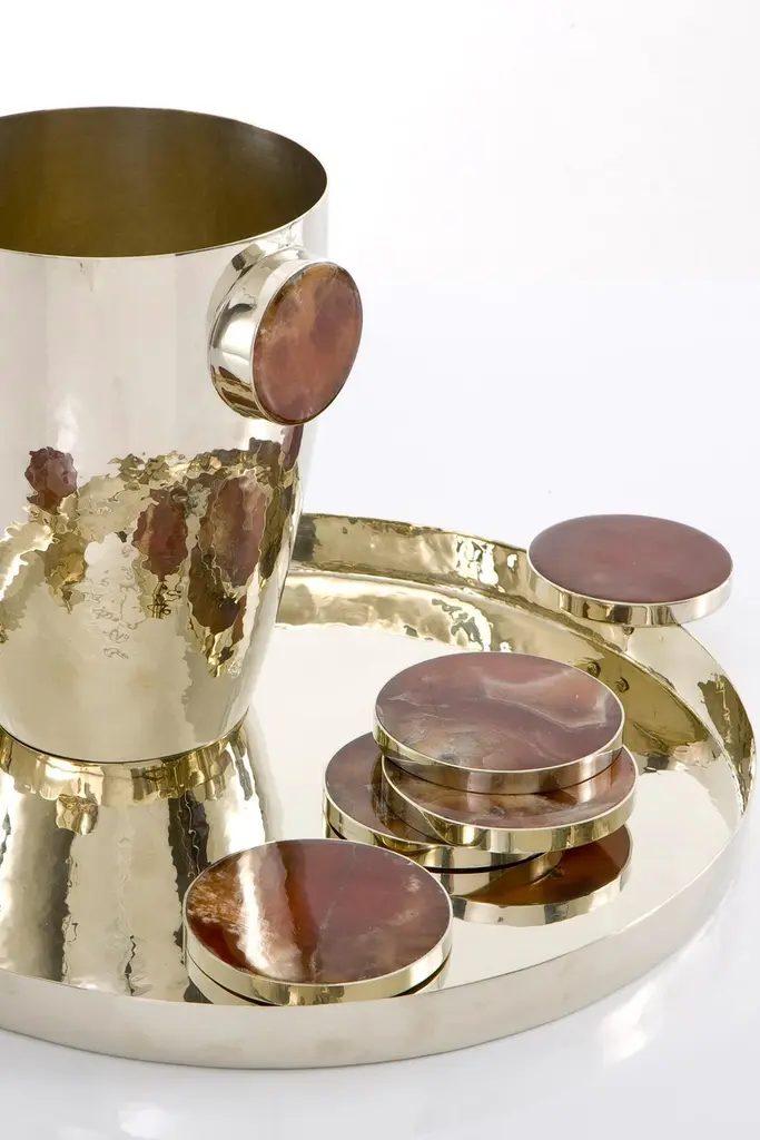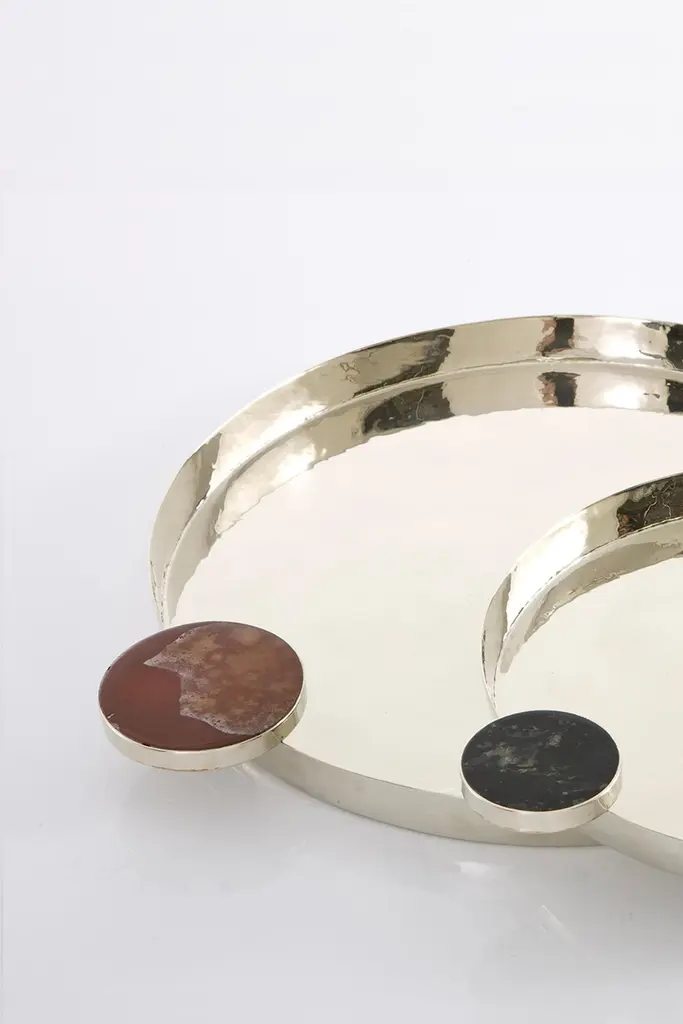 The LAGO collection of circular shapes on trays and champagne glasses, made with a combination of materials such as alpaca silver and onyx, black, brown and cream.Our pieces are made by hand. One of a kind.Natural onyx may vary in color.