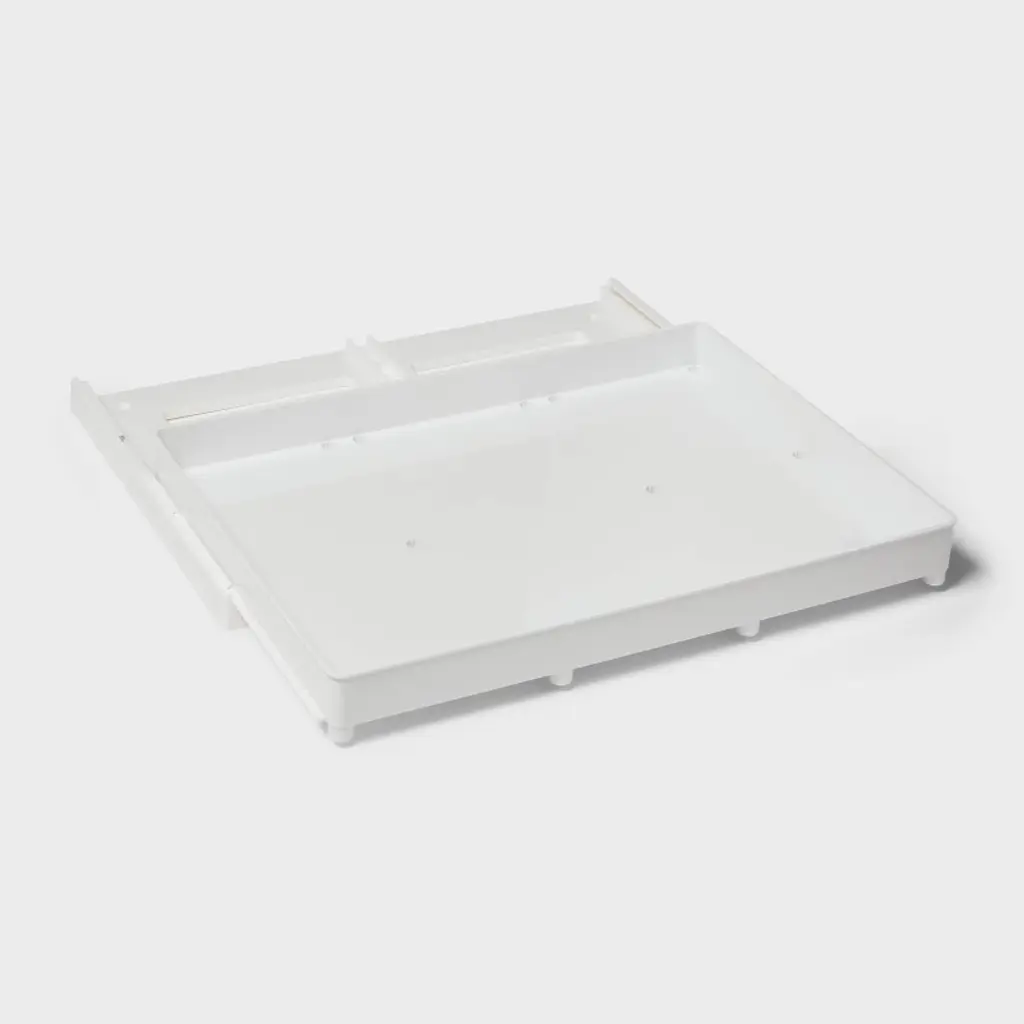 Enhance the functionality of your storage space with this Large Gliding Tray from Brightroom™. Made from recycled PET and post-consumer recycled plastic blend material, this rectangular tray can be attached to a cabinet to store your frequently used items. Designed in a white hue, this tray glides effortlessly and allows you to easily access the stored items in compact spaces. Brightroom™: See your space in a new light.
