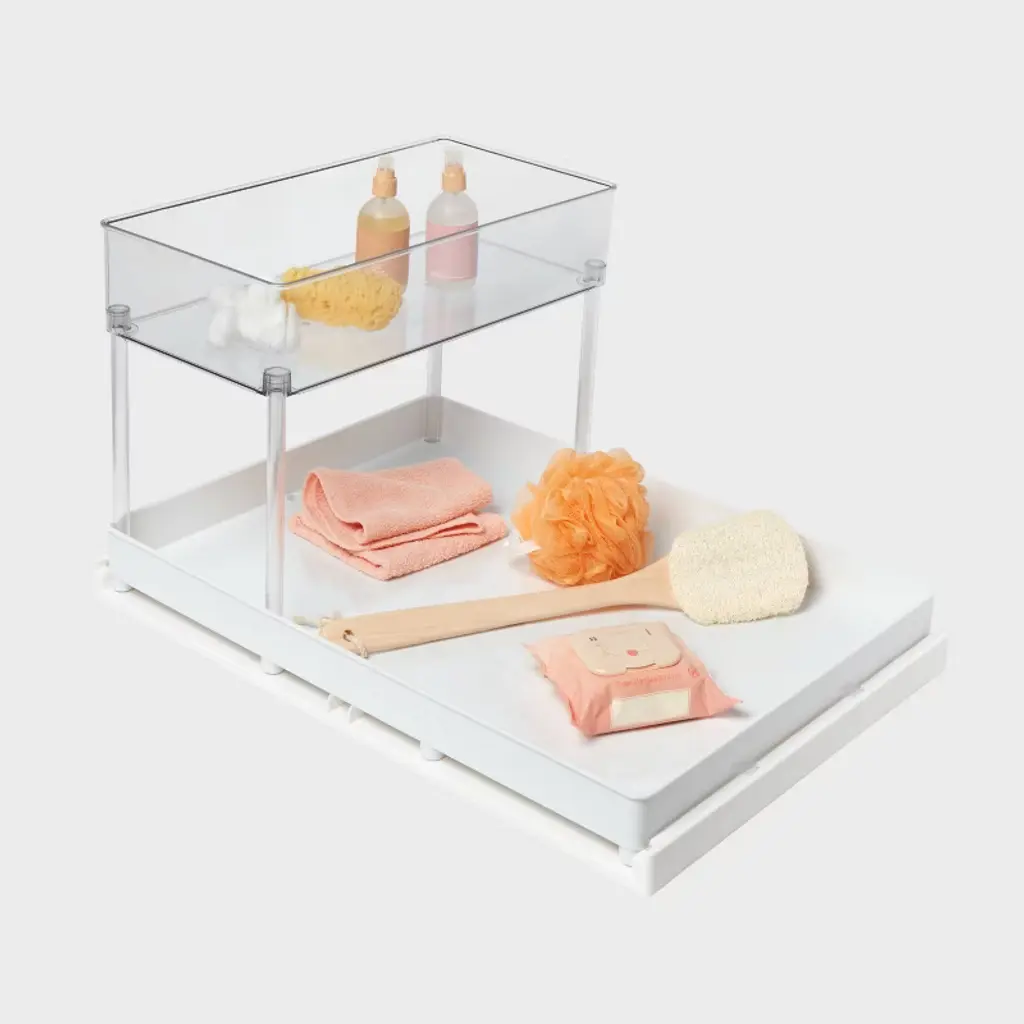 Organize your essentials with ease with this Large Gliding Tray with Bin from Brightroom™. Made of recycled PET and post-consumer recycled plastic, this cabinet organizer features a clear shelf on the top and a base gliding tray to store your everyday essentials. Featuring raised edges, this tray with a shelf glides smoothly to easily access hard-to-reach items. Designed for indoor use, it fits most standard cabinets.Brightroom™: See your space in a new light.