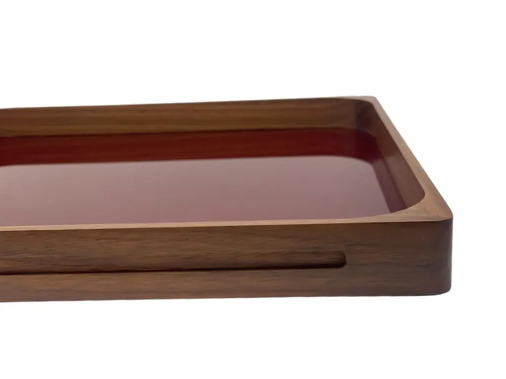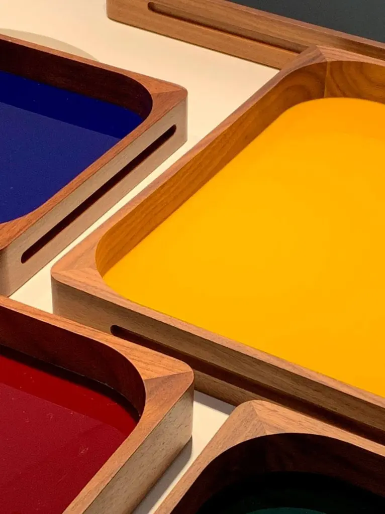 With its modernist-inspired edges and vibrant base, the Square tray was designed by Gisela Simas in 2014. Made of freijó wood and acrylic, this versatile piece transitions seamlessly from the dining table to the bedroom, serving multiple functions. Available in three different sizes, the large tray (G) can be used as a bar, the medium tray (M) for serving, and the small tray (P) on the bedside table.