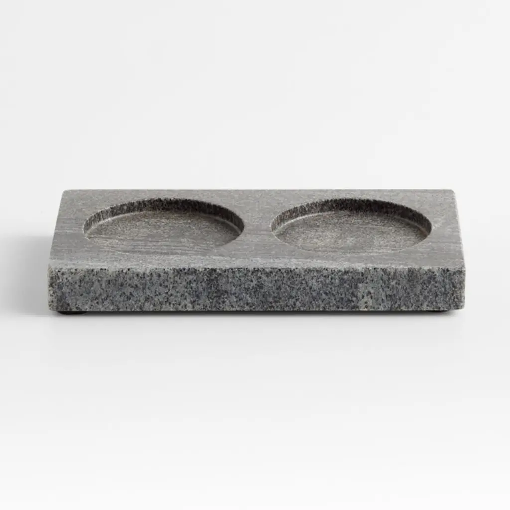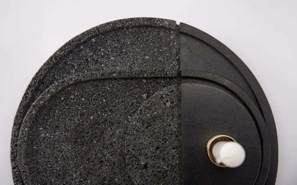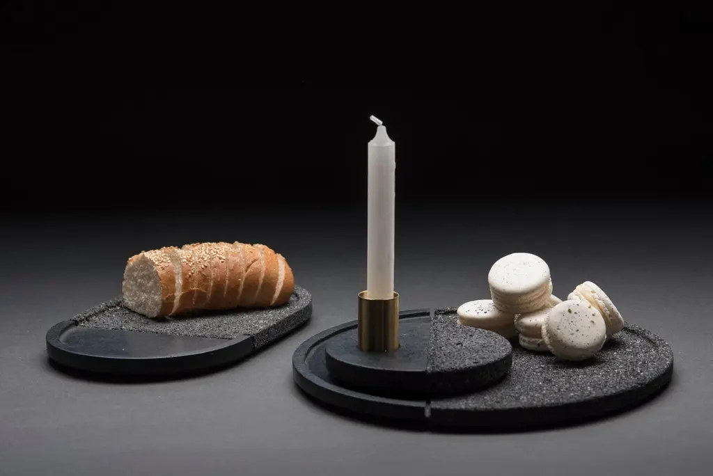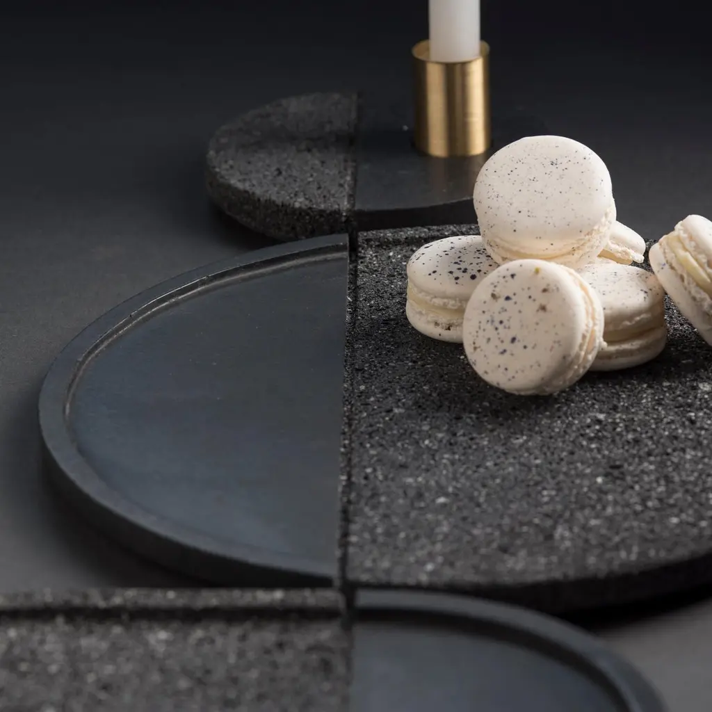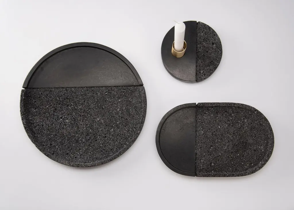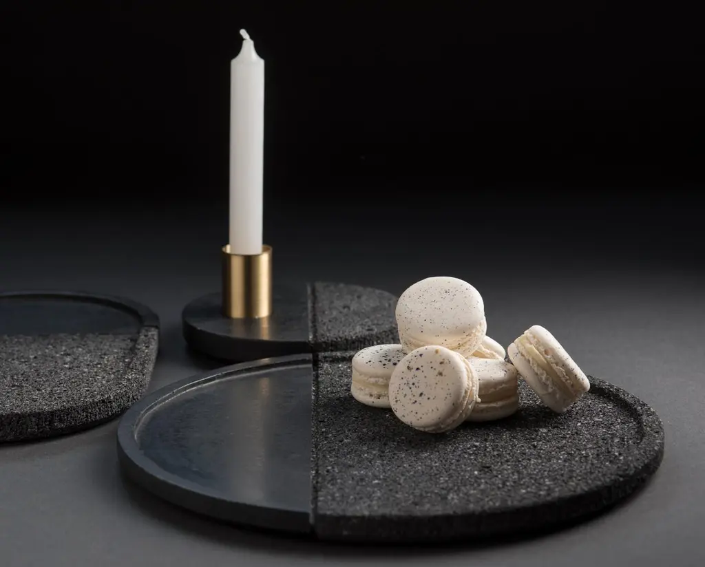Volcanic stone is a witness to the power of nature: hand-polished by craftsmen with a millenary tradition, its unruly nature is transformed into a sensible and human object. With their Dual texture, the collection of lava plates is as much an homage to Mexican tradition as it is a glance in the direction of modernity. A brass accent completes the harmonious balance and reveals that lava plates are as decorative as they are functional. Available in sets of three plates or individually.Materials: Volcanic Stone and Brass Measurements:30 cm x 30 cm x 2 cm27 cm x 17 cm x 2 cm14 cm x 14 cm x 2 cm.