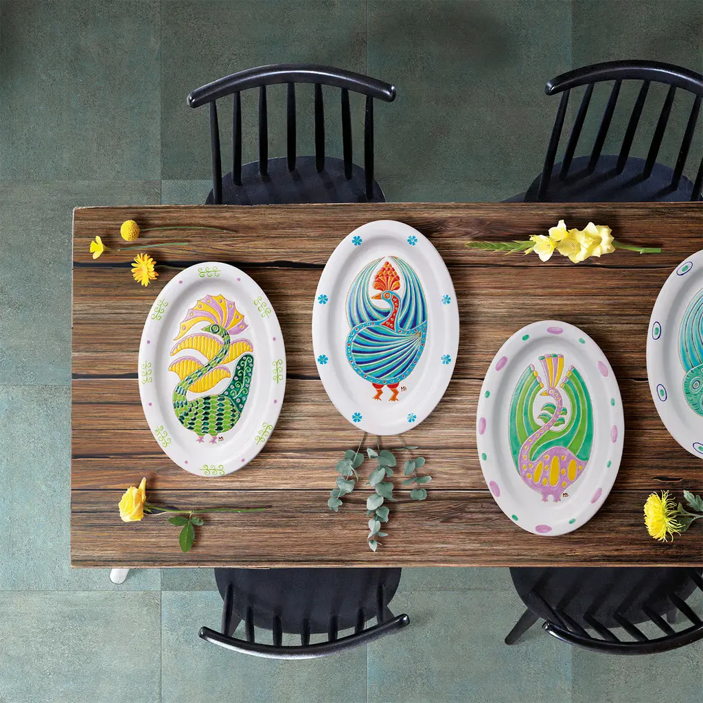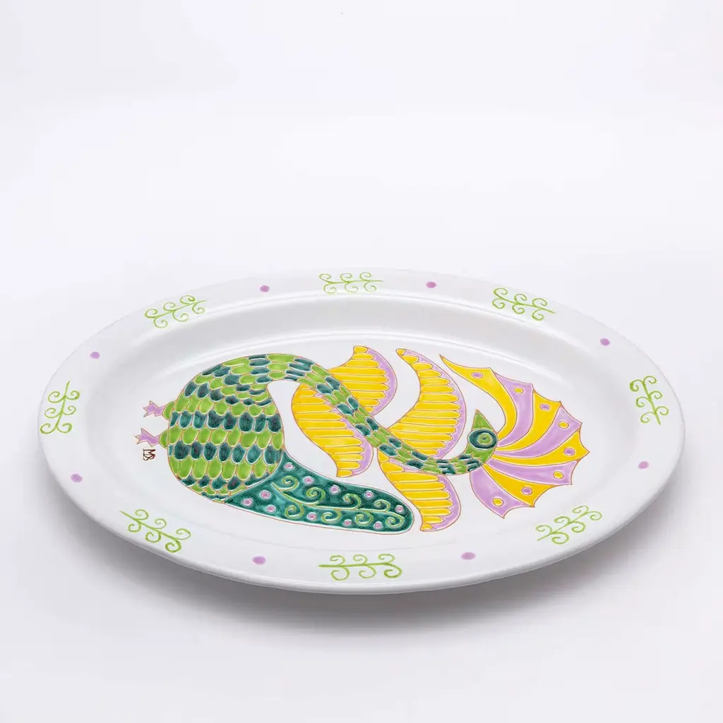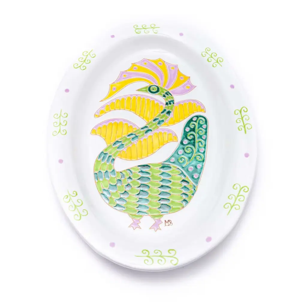 Sacred bird to Egyptians and originally from Ethiopia, the phoenix is the stupefying decorative focus of this oval ceramic tray. Finely engraved by hand following Sardinian traditional techniques, its plumage appears richly detailed and painted in vibrant shades of green, emerald, and yellow finished with sober beige accents. A motif of dots and curls accents the rim.