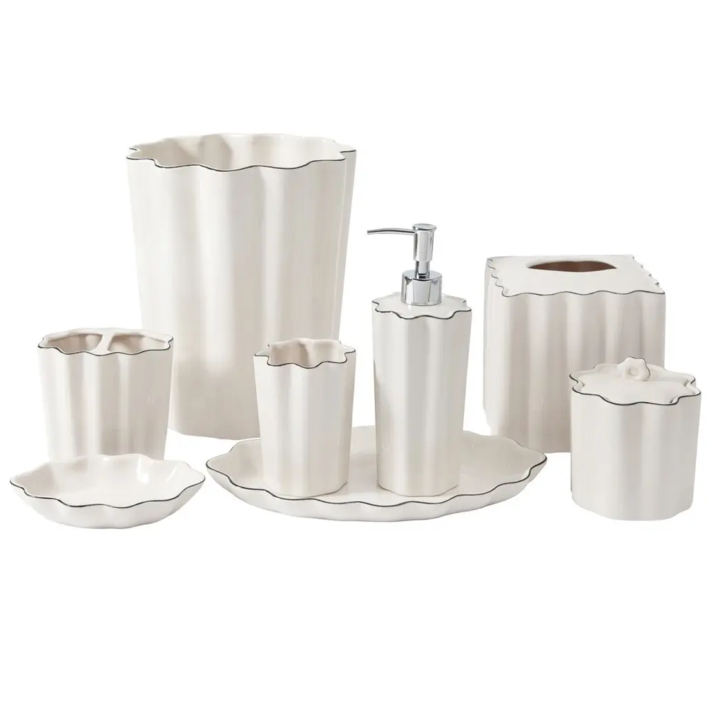 Le Marais Bath Accessories Collection is crafted from fine porcelain. Each piece features an scalloped design with black-trim detail on top. Imported.