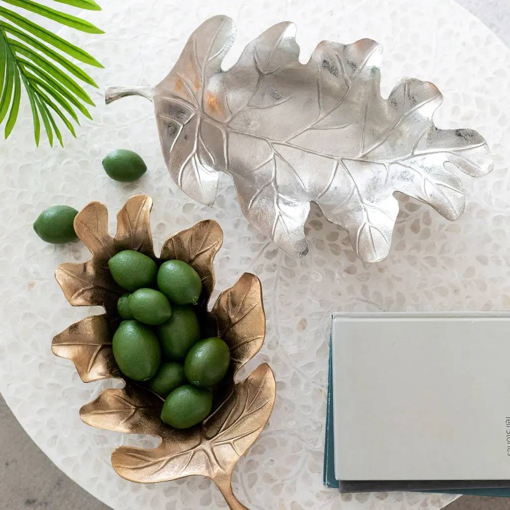 This long metal brass bowl is striking because of the detail and texture of the oak leaf, and the cut out molded shape of the bowl offers so much movement in the shape. Its a large and elongated bowl/ platter and would work well in so many different spaces, a dining table, buffet or kitchen island filled with fruit, the possibilities are endless.