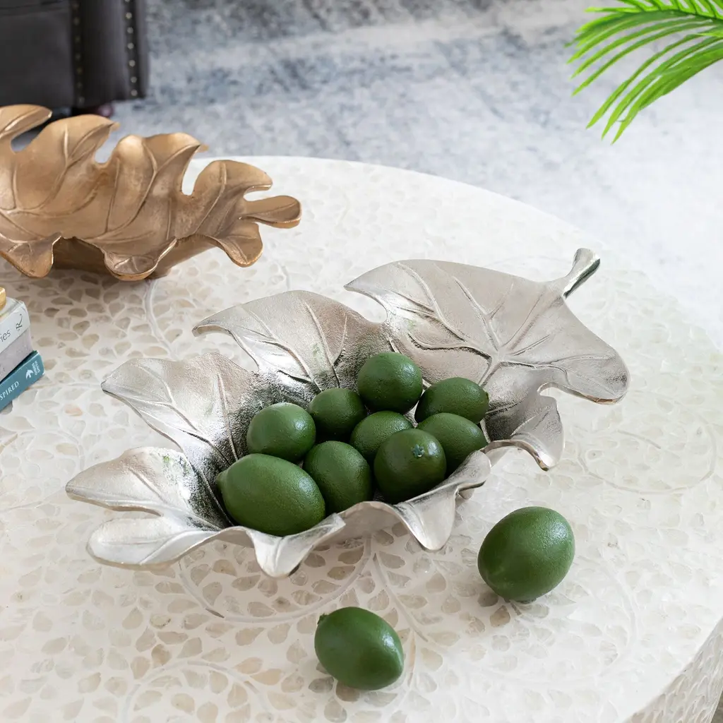 This Aluminum Leaf Tray is striking because of the detail and texture of the oak leaf, and the cut out molded shape of the tray offers so much movement in the shape. Its a large and elongated tray / platter and would work well in so many different spaces, a dining table, buffet or kitchen island filled with fruit, the possibilities are endless.