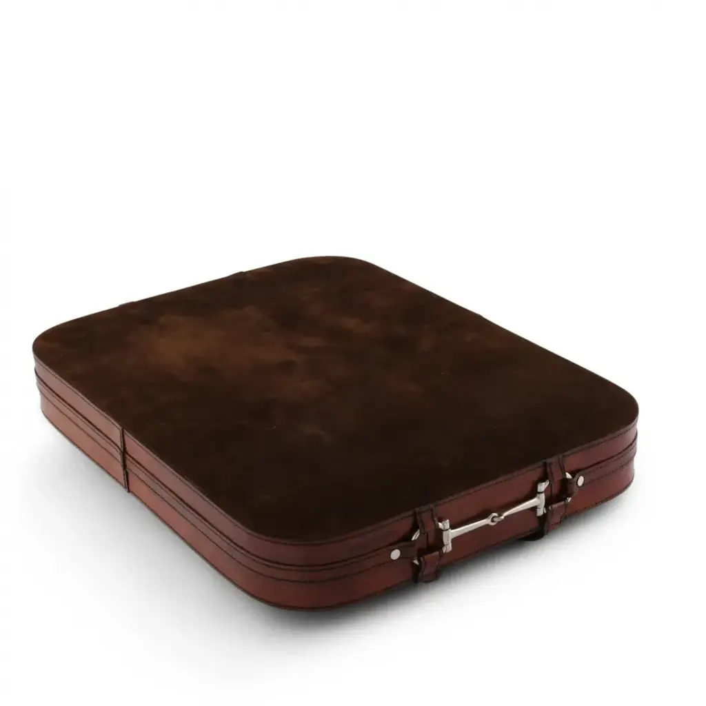 Enrich your home decor with our High End Leather Serving Tray. Handcrafted with precision using high-quality genuine leather, this generously sized tray (20" x 15") is perfect for entertaining. Adorned with a pewter equestrian bit on the handles, its unique design is a noteworthy addition to any equestrian collection. Whether you are serving drinks, snacks, or making a style statement, this tray blends durability with elegance. Vagabond House is a family-owned American company specializing in fine pewter tableware, servingware and giftware. Largely inspired by nature, their exclusive products are designed to be unique, functional heirlooms for those who seek to express tradition and style in both family and formal entertaining.