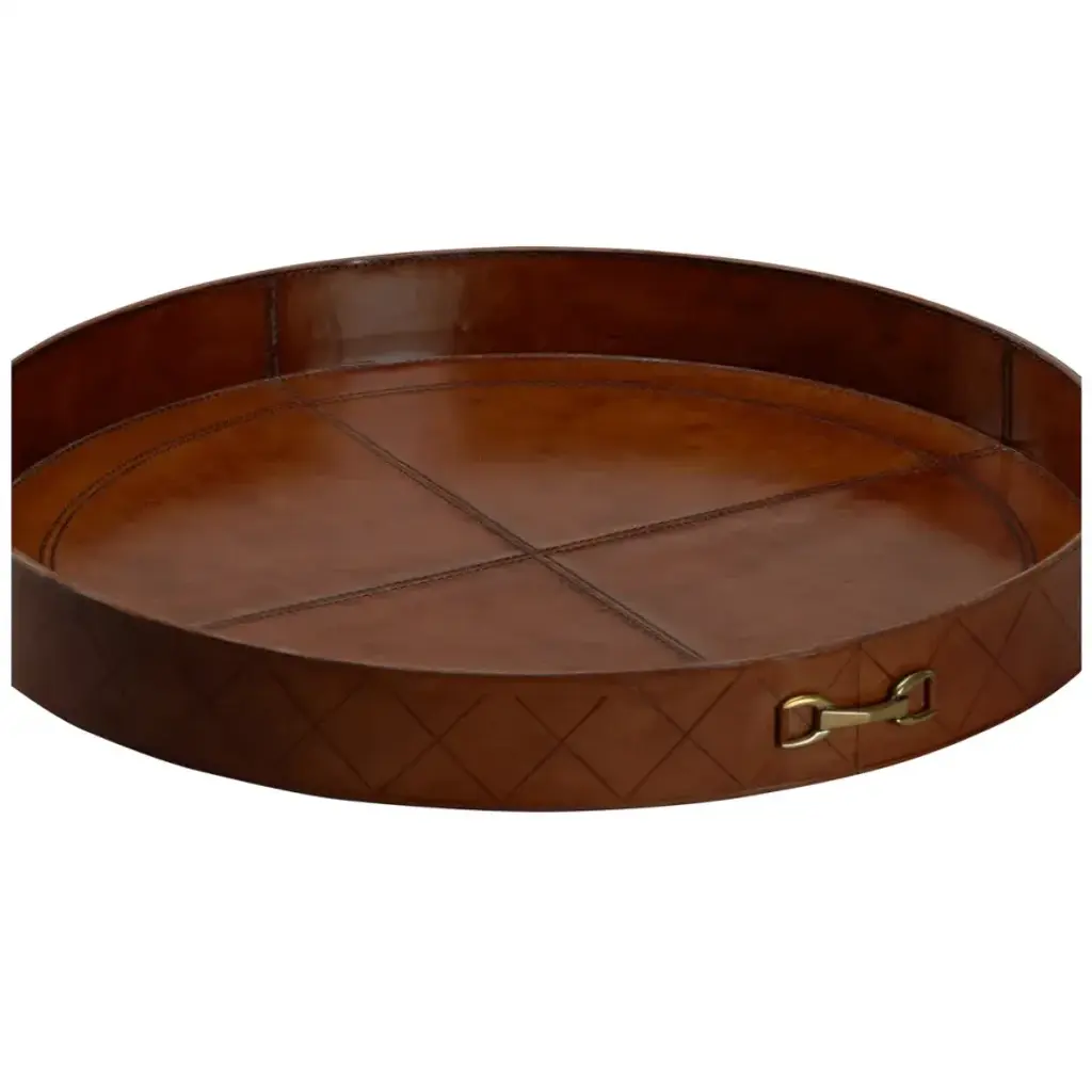 A sleek, circular design with stitching details on tan leather brings a timeless look to the Round Leather Tray. The pair of trays are perfect for display on a large ottoman or used as a bar trays.
