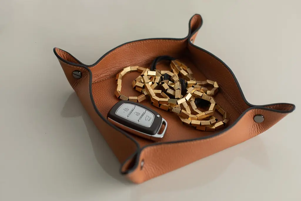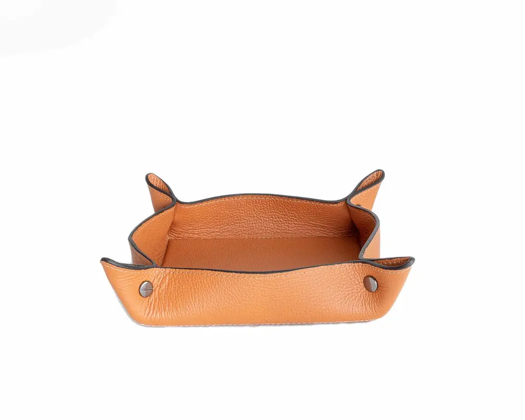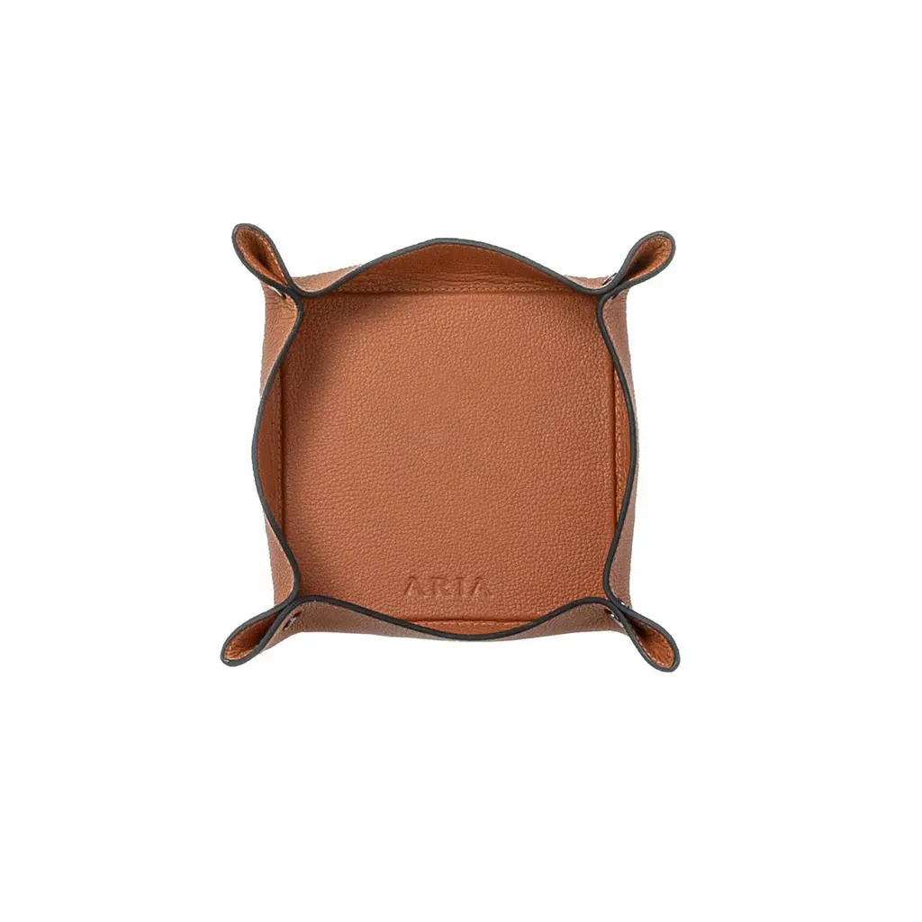 TRINKET TRAY The Trinket Tray - Object Holder offers multifunctional organization for daily essentials, allowing for endless creative possibilities.Craft in leather with sleek edge paint finish and chrome metal, which add a unique refinement to the piece.Handmade in Brazil with Top Grain Leather.Free shipping to USA/Canada/UK and Europe.ABOUT ARIA HOMEARIA HOME meticulously considers the design of each piece, ensuring they not only serve their purpose but also infuse your space with sophistication and distinctive style.Every item is crafted individually, with the utmost care and expertise that only leather artistry can provide. Get inspired by the colors, shapes and compositions we tailored exclusively for you.WHAT MAKES ARIA UNIQUE.Our design and refinements are unparalleled. Each piece is meticulously crafted with the exacting standards of finishing techniques learned from artisans in France and Italy, resulting in singular articles tailored for the luxury market. From the selection of color tones to the choice of sewing thread thickness, every detail is carefully considered to craft a distinctive piece. The majority of our processes are handmade, enabling us to elevate our creations to the level of artistry.(Ps. Objects displayed on top of trays are not for sale / The color tone of the products seen on the monitor may vary from the physical product.)