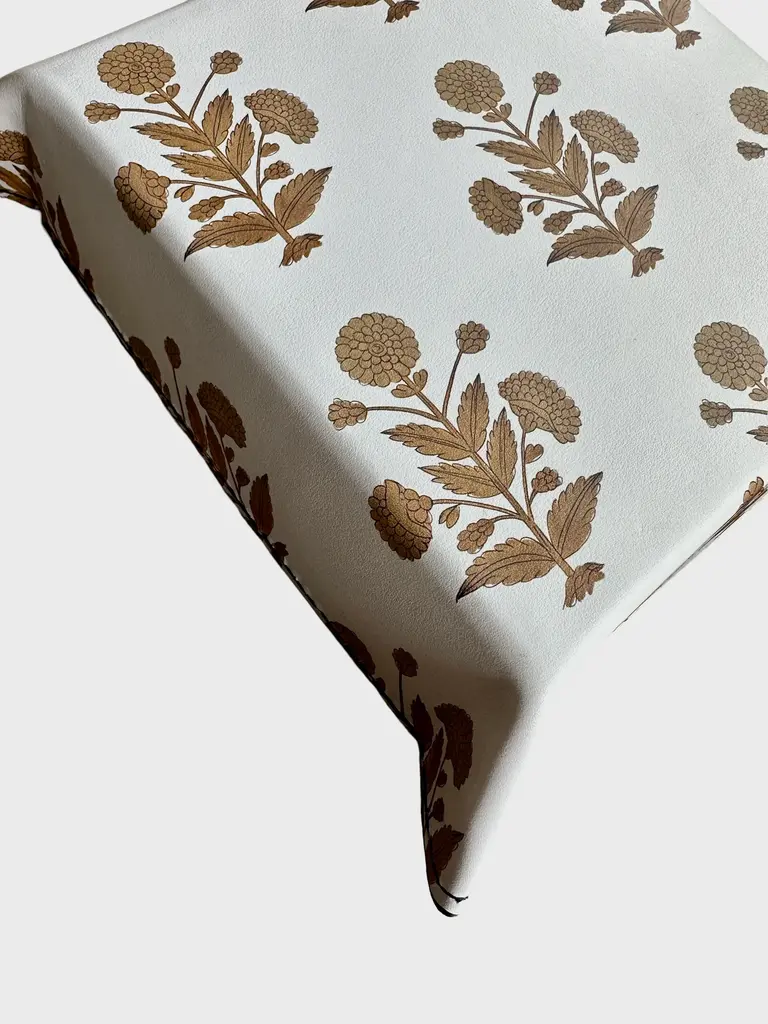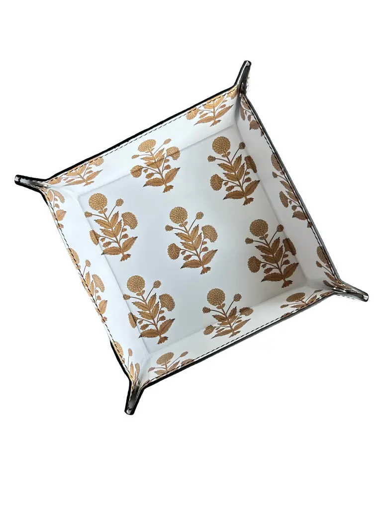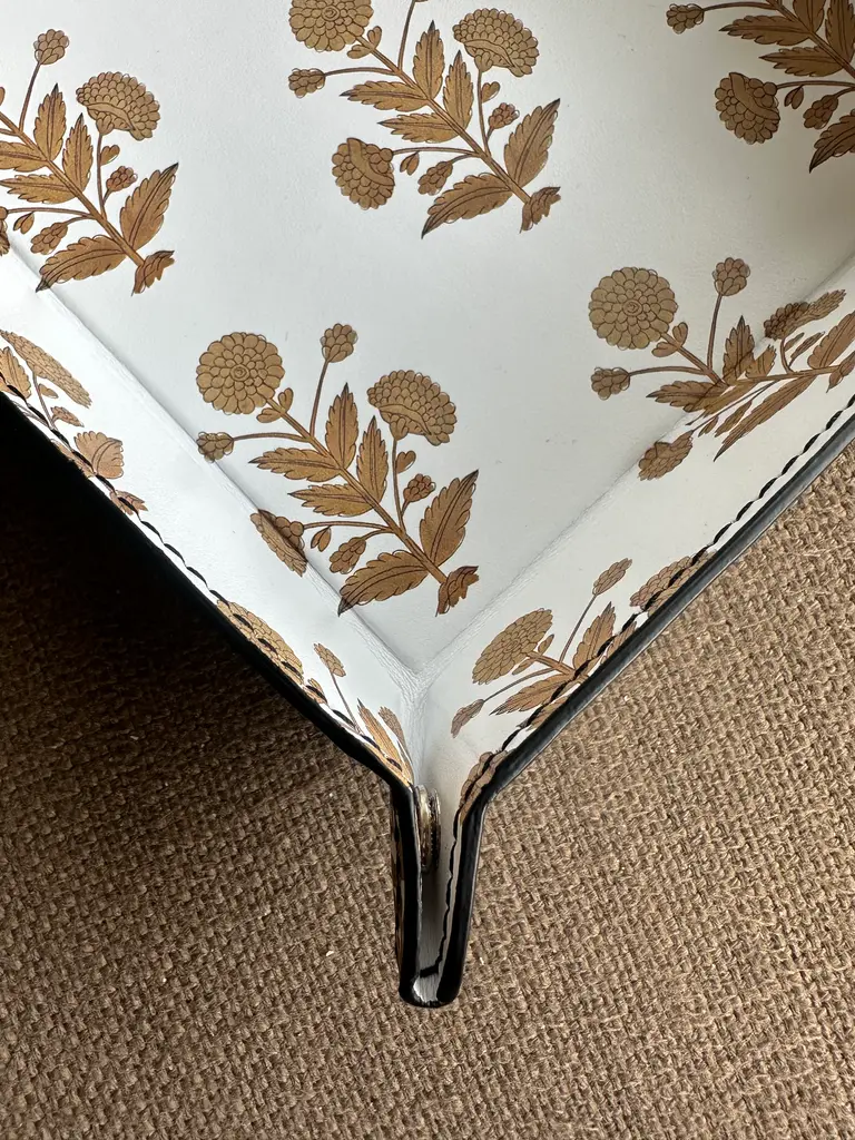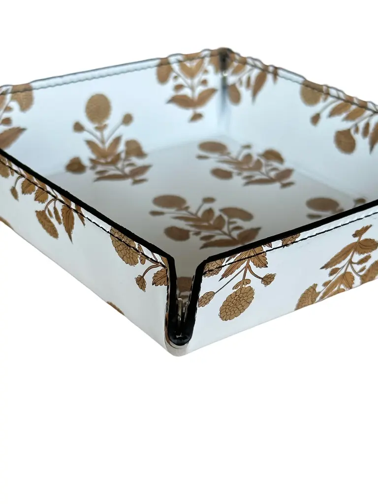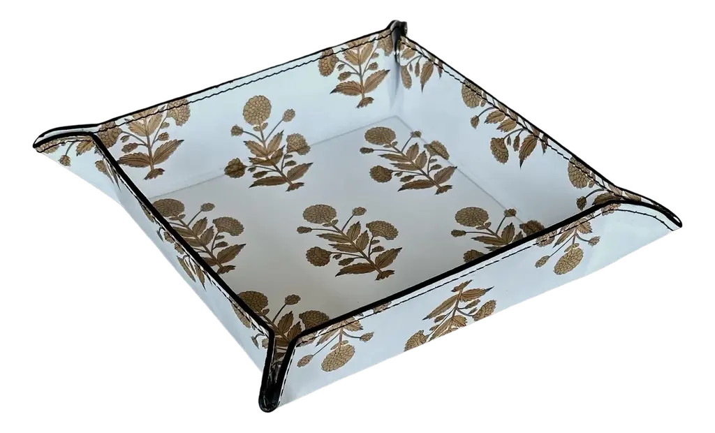 Hand-crafted in London by artists using high quality genuine Napa leather, this luxurious trinket tray brings together elegance and functionality. Adorned with Two Pink Parrots' signature motifs in brown, it reflects our love for intricate detail and timeless design. Perfect for holding jewelry, keys, or small keepsakes, each tray is hand-stitched from premium leather, ensuring a rich texture and lasting durability. Whether it sits on your table or your desk, this piece adds a touch of sophistication to your everyday moments. A must-have for lovers of artisan craftsmanship. Since this is a handmade custom order made by artisans in London, pleass allow 2-4 weeks for shipping and delivery.. Measurements are 6.5" x 6.5", corner to corner Printed with running motifs at the back too!