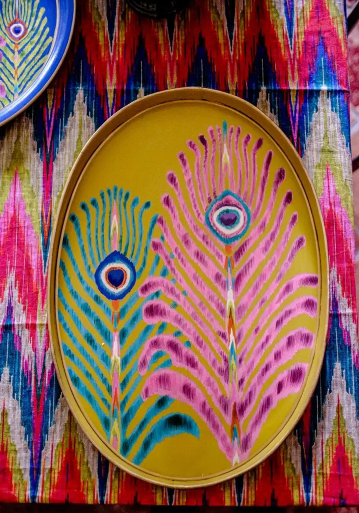 Renowned British designer Matthew Williamson, known for his bold use of colour and nature-inspired motifs, has created a tabletop and textile collection with Les Ottomans. This collaboration showcases his signature peacock design, featured here on an oval handprinted iron tray. With vibrant hues of blue, pink, purple, and yellow, this tray embodies Williamson's iconic style, bringing a touch of artistry to any space.Williamson's designs have seamlessly transitioned into interiors, with notable commissions at Blakes Hotel and Belmond La Residencia.