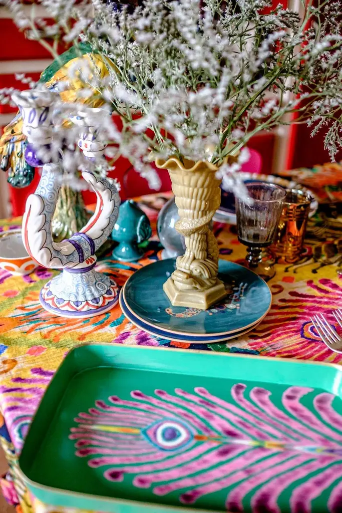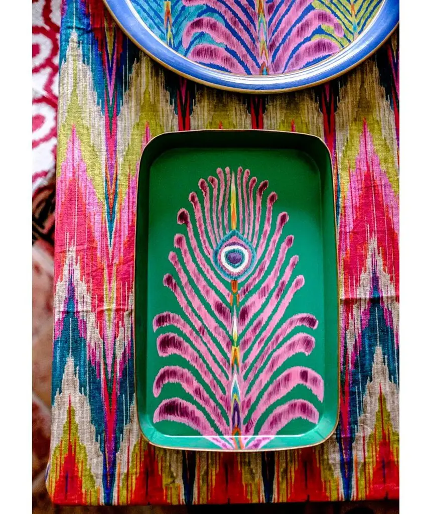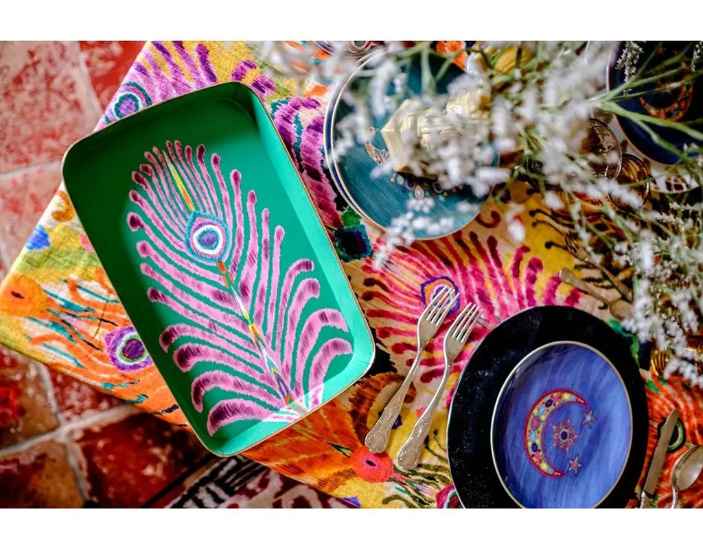 Renowned British designer Matthew Williamson, known for his bold use of colour and nature-inspired motifs, has created a tabletop and textile collection with Les Ottomans. This collaboration showcases his signature peacock design, featured here on an oval handprinted iron tray. With vibrant hues of blue, pink, purple, and yellow, this tray embodies Williamson's iconic style, bringing a touch of artistry to any space.Williamson's designs have seamlessly transitioned into interiors, with notable commissions at Blakes Hotel and Belmond La Residencia.