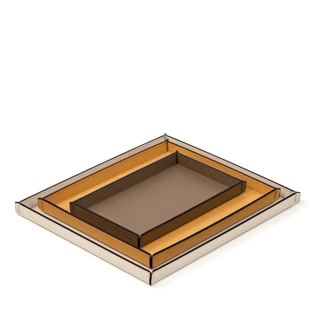 Explore the versatile Leslie collection, offering three sizes for custom sets. Crafted from soft calfskin leather, each tray boasts a sturdy structure with sewn closing corners. Available in rectangular and square shapes, Leslie serves as a practical display tray for daily use. Please, contact the Concierge for further information.