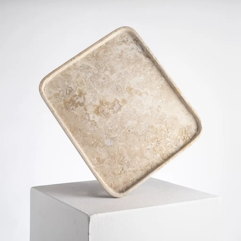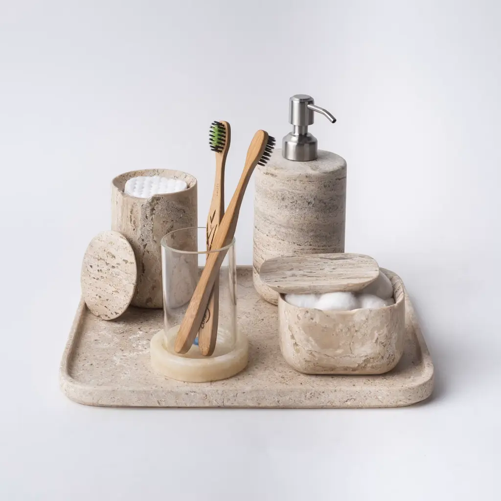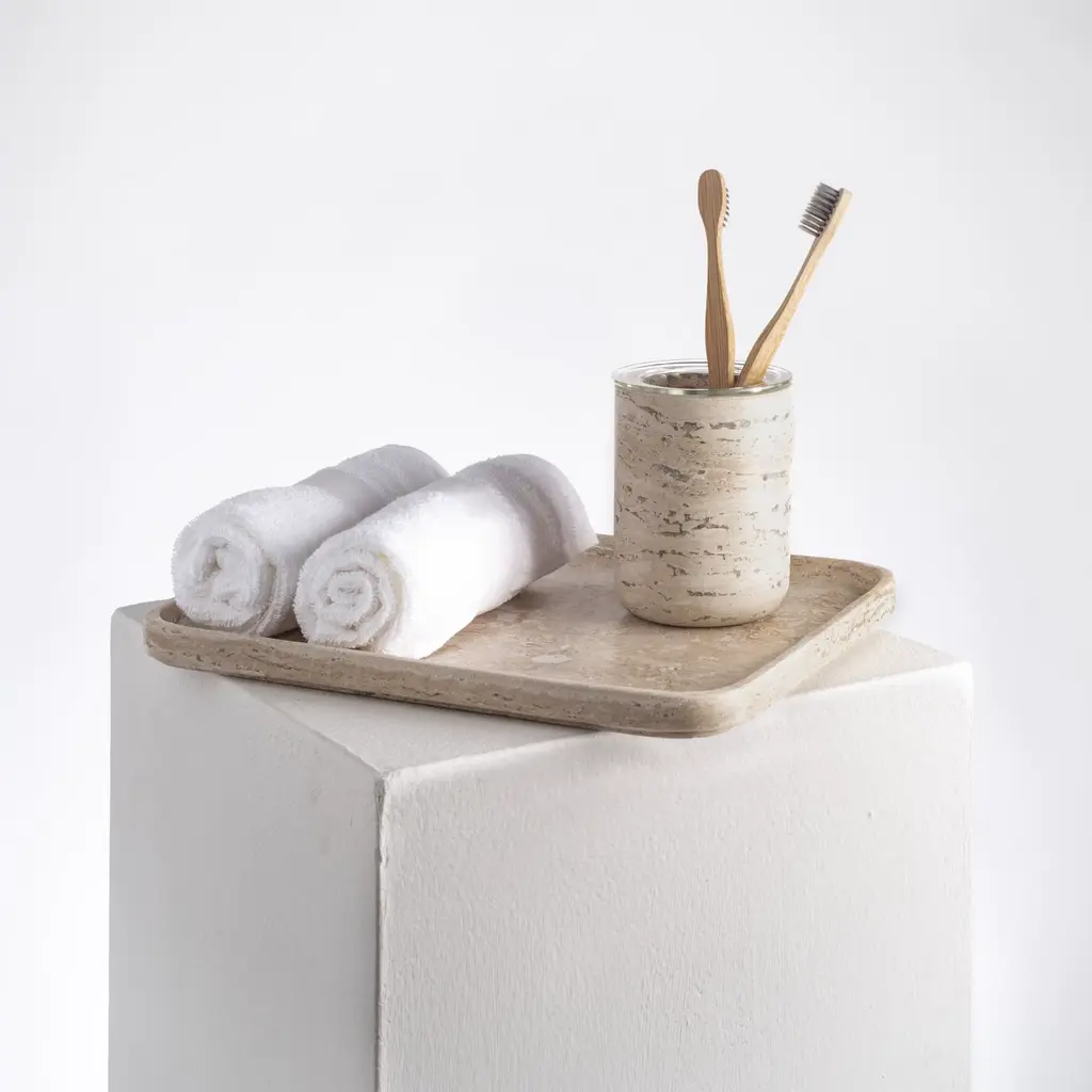 Beautiful hand carved marble or onyx tray. Functional to place towels, dispensers, containers, bathroom products or cosmetics. It is usually located in a bathroom vanity, bedroom, bureau or any other place that is thought of.The stone regularly contains a beautiful variety of betas and contrasts.Available in two sizes.Less Is More Collection Set Accessory